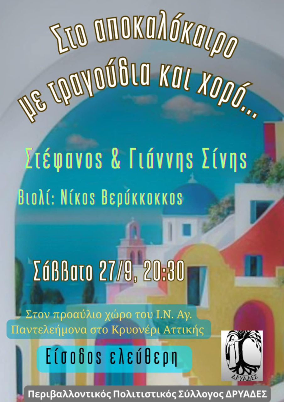 Θυμίζουμε στα μέλη και τους φίλους των Δρυάδων, πως αυτό το ΣΑΒΒΑΤΟ 27/9/25 και ώρα 20.00, θα πραγματοποιηθεί η μουσική βραδιά «ΣΤΟ ΑΠΟΚΑΛΟΚΑΙΡΟ ΜΕ ΤΡΑΓΟΥΔΙΑ ΚΑΙ ΧΟΡΟ», με πολύ χορό στο χώρο του Αγίου Παντελεήμονα.