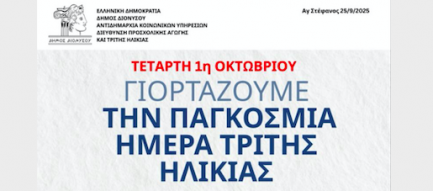 ΠΡΟΣΚΛΗΣΗ ΤΕΤΑΡΤΗ 1η ΟΚΤΩΒΡΙΟΥ ΓΙΟΡΤΑΖΟΥΜΕ ΤΗΝ ΠΑΓΚΟΣΜΙΑ ΗΜΕΡΑ ΤΡΙΤΗΣ ΗΛΙΚΙΑΣ Ο Δήμος Διονύσου, η Αντιδημαρχία Κοινωνικών Υπηρεσιών και τα Κ.Α.Π.Η του Δήμου μας, διοργανώνουν μια γ[...]