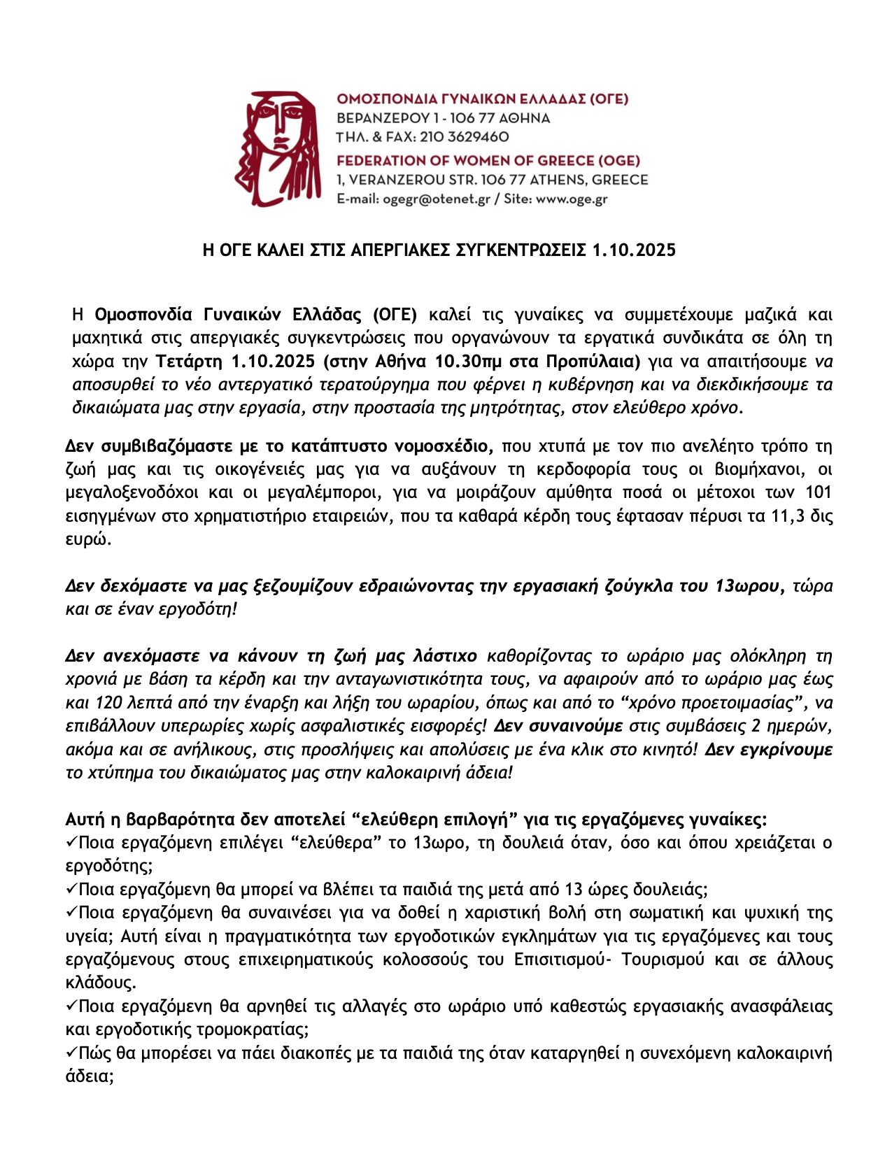 Η Ομάδα Γυναικών Διονύσου (μέλος της ΟΓΕ) καλεί να συμμετέχουμε μαζικά και μαχητικά στις απεργιακές συγκεντρώσεις που οργανώνουν τα εργατικά συνδικάτα σε όλη τη χώρα την Τετάρτη 1.10.2025 (στην Αθήνα 10.30πμ στα Προπύλαια).