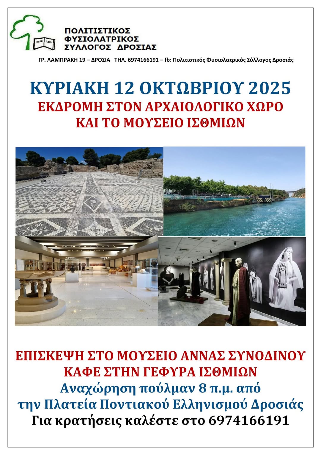Η πολιτιστική και φυσιολατρική δράση του συλλόγου μας για τη σαιζόν 2025-2026 αρχίζει με μια ενδιαφέρουσα εκδρομή και ξενάγηση στον αρχαιολογικό χώρο και το αρχαιολογικό μουσείο Ισθμίων, καθώς και το νεοϊδρυθέν στο Λουτράκι αφιερωματικό μουσείο στη μεγάλη κυρία του ελληνικού θεάτρου Άννα Συνοδινού, ενώ θα καταλήξουμε στο καφέ της γέφυρας των Ισθμίων για καφέ ή φαγητό!