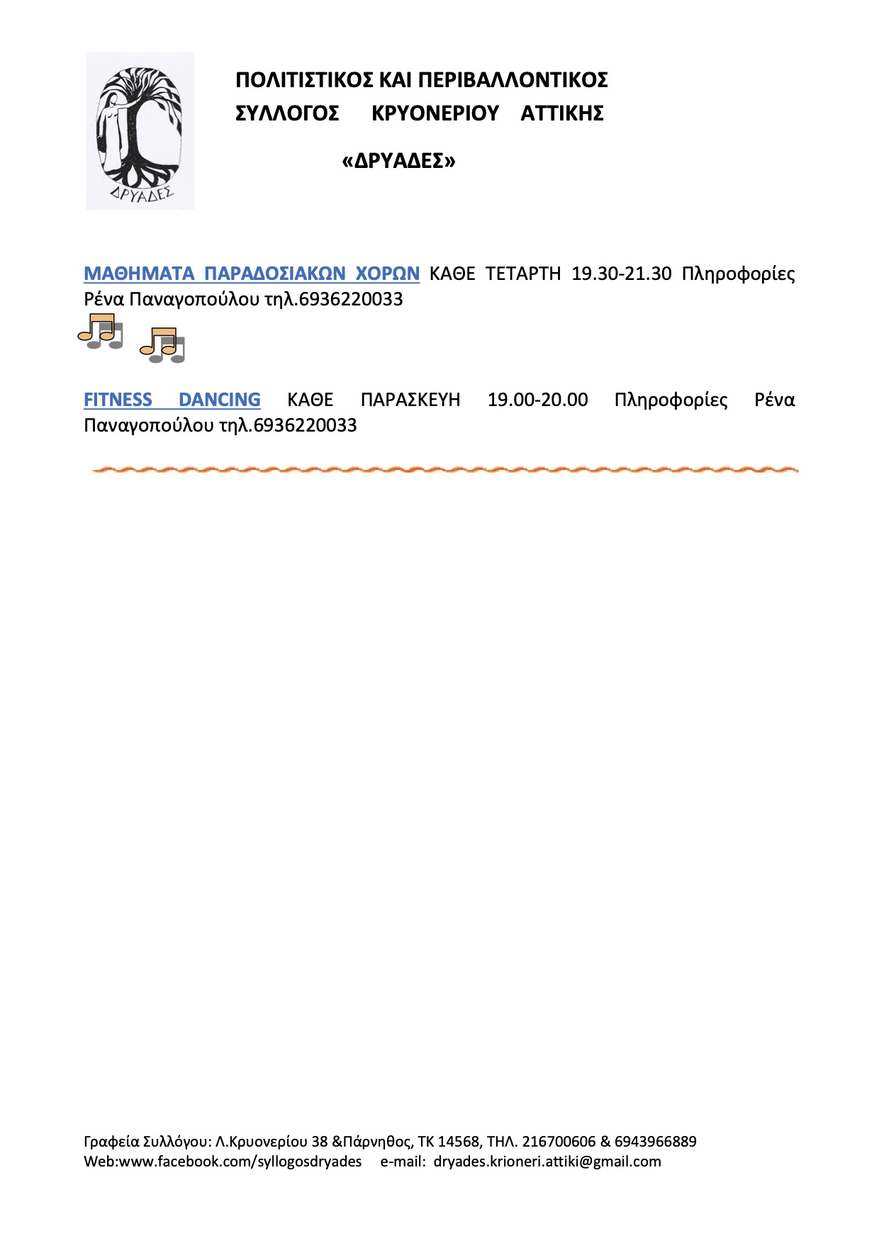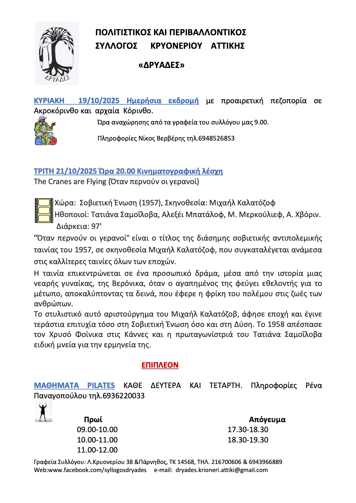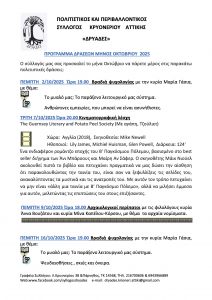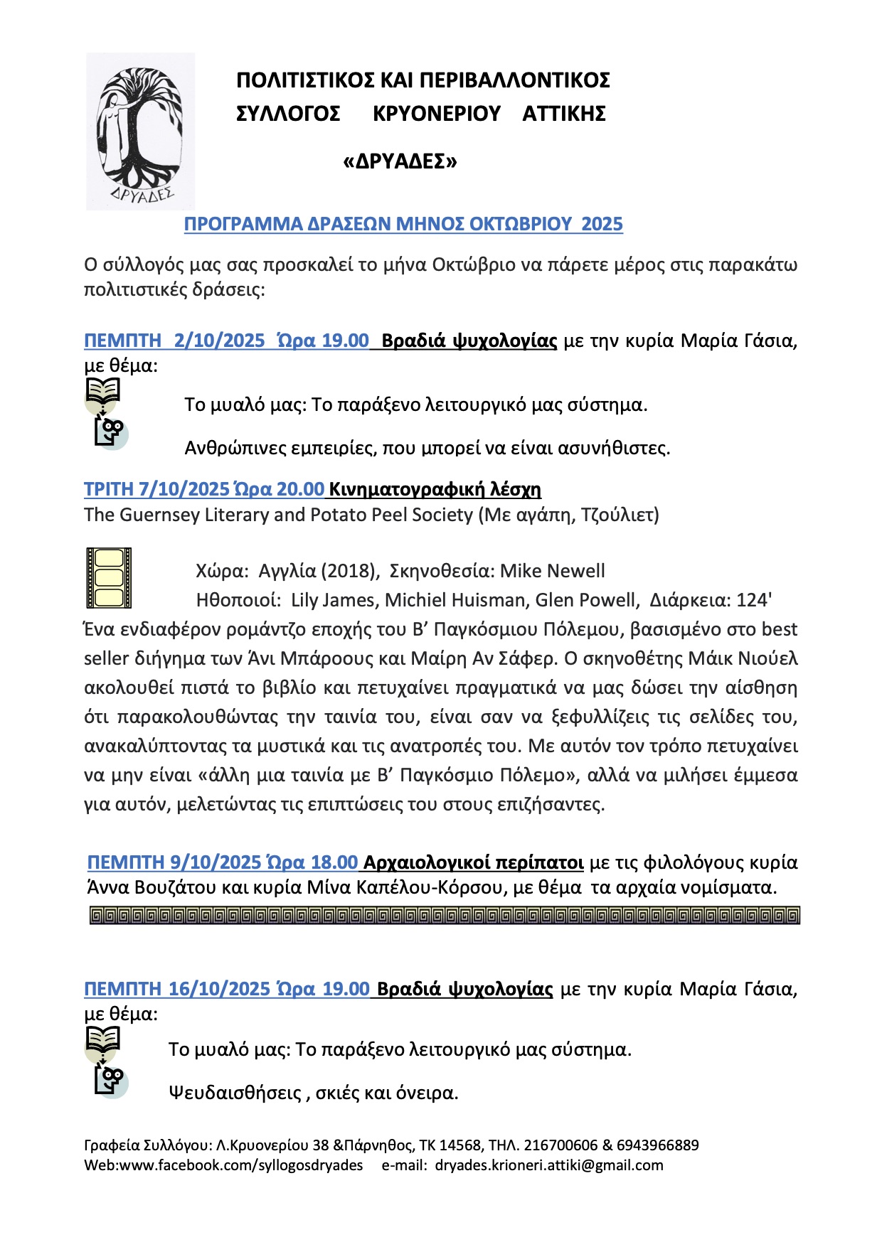 Πολιτιστικός- Περιβαλλοντικός Σύλλογος ΔΡΥΑΔΕΣ: Το πρόγραμμα δράσεων για τον Οκτώβριο