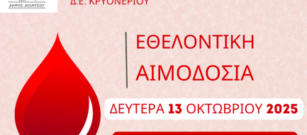 ΠΡΟΣΚΛΗΣΗ Ο Δήμος Διονύσου και η Δ.Ε. Κρυονερίου σας καλεί να συμμετάσχετε στην Εθελοντική Αιμοδοσία: 📅 Δευτέρα 13 Οκτωβρίου 2025 ⏰ Από 17:00 έως 20:00 Με μία μόνο πράξη, μπορείς ν[...]