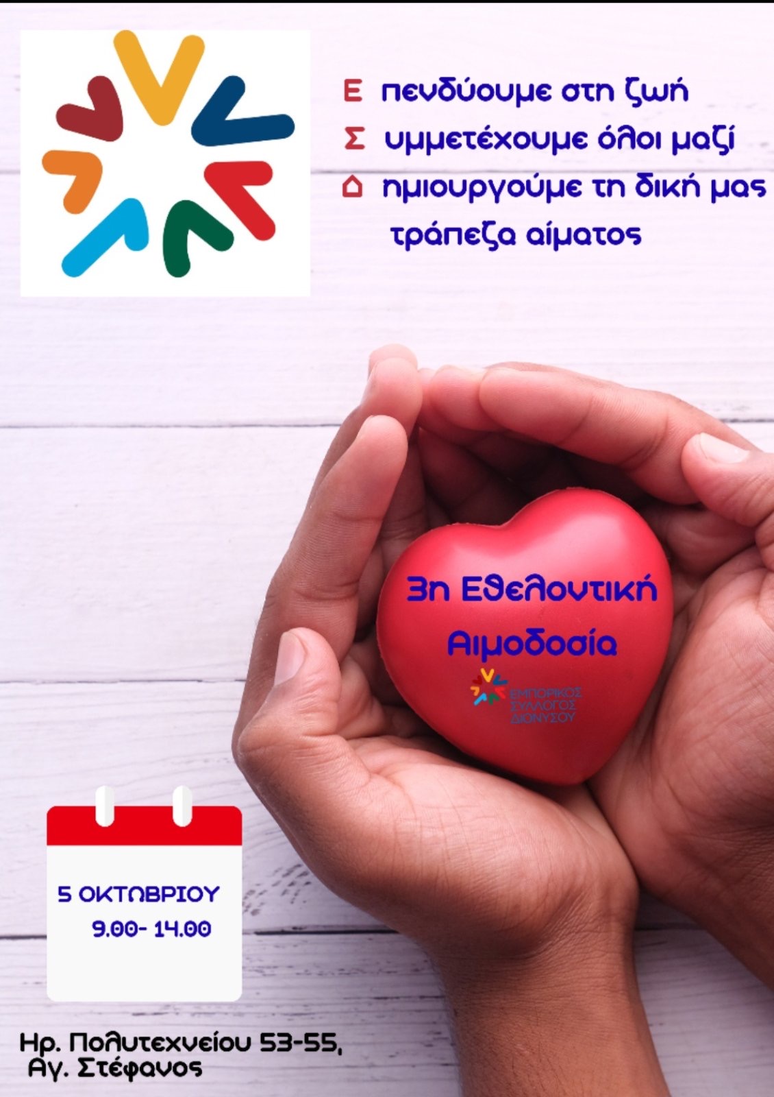 με μεγάλη χαρά θα θέλαμε να σας ενημερώσουμε ότι ο ΕΣΔ διοργανώνει την 3η Εθελοντική Αιμοδοσία και καλεί κάθε πολίτη και κάθε επαγγελματία του Δήμου μας να γίνει μέρος αυτής της μεγάλης αλυσίδας αλληλεγγύης.