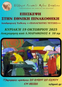 Επίσκεψη στην Εθνική Πινακοθήκη, όπου πραγματοποιείται αναδρομική έκθεση με τίτλο για τα 100 χρόνια από τη γέννηση του μεγάλου ζωγράφου, χαράκτη, δάσκαλου και ακαδημαϊκού Παναγιώτη Τέτση, με τίτλο “Η εμμονή του βλέμματος” προγραμματίζει ο Σύλλογος Γυναικών Αγ. Στεφάνου, την Κυριακή 19 Οκτωβρίου.