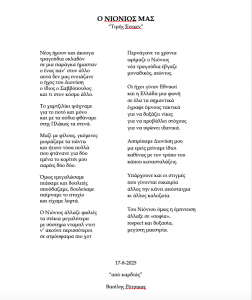 Τον ίδιο μήνα στην Άνοιξη ο Β. Ρότσικας έπιανε μολύβι και χαρτί και έγραφε τους παρακάτω στίχους, αφιερωμένους «από καρδιάς» στον Νιόνιο.