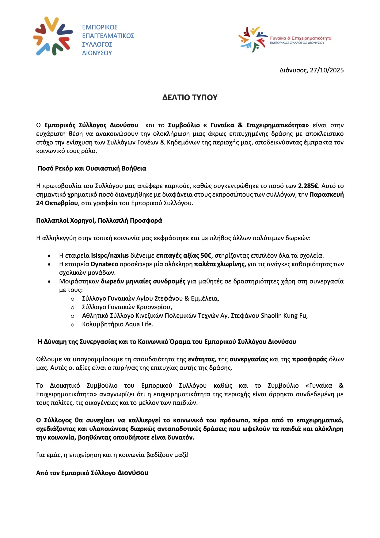 Ο Εμπορικός Σύλλογος Διονύσου και το Συμβούλιο « Γυναίκα & Επιχειρηματικότητα» είναι στην ευχάριστη θέση να ανακοινώσουν την ολοκλήρωση μιας άκρως επιτυχημένης δράσης με αποκλειστικό στόχο την ενίσχυση των Συλλόγων Γονέων & Κηδεμόνων της περιοχής μας, αποδεικνύοντας έμπρακτα τον κοινωνικό τους ρόλο.