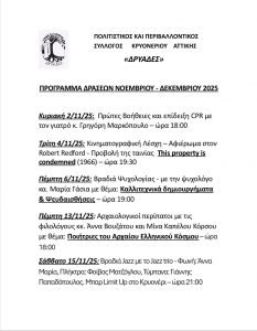 ü Πρόγραμμα με τις δράσεις του Συλλόγου για τους μήνες Νοέμβριο και Δεκέμβριο.