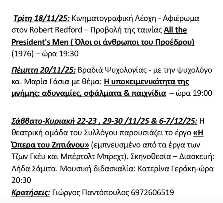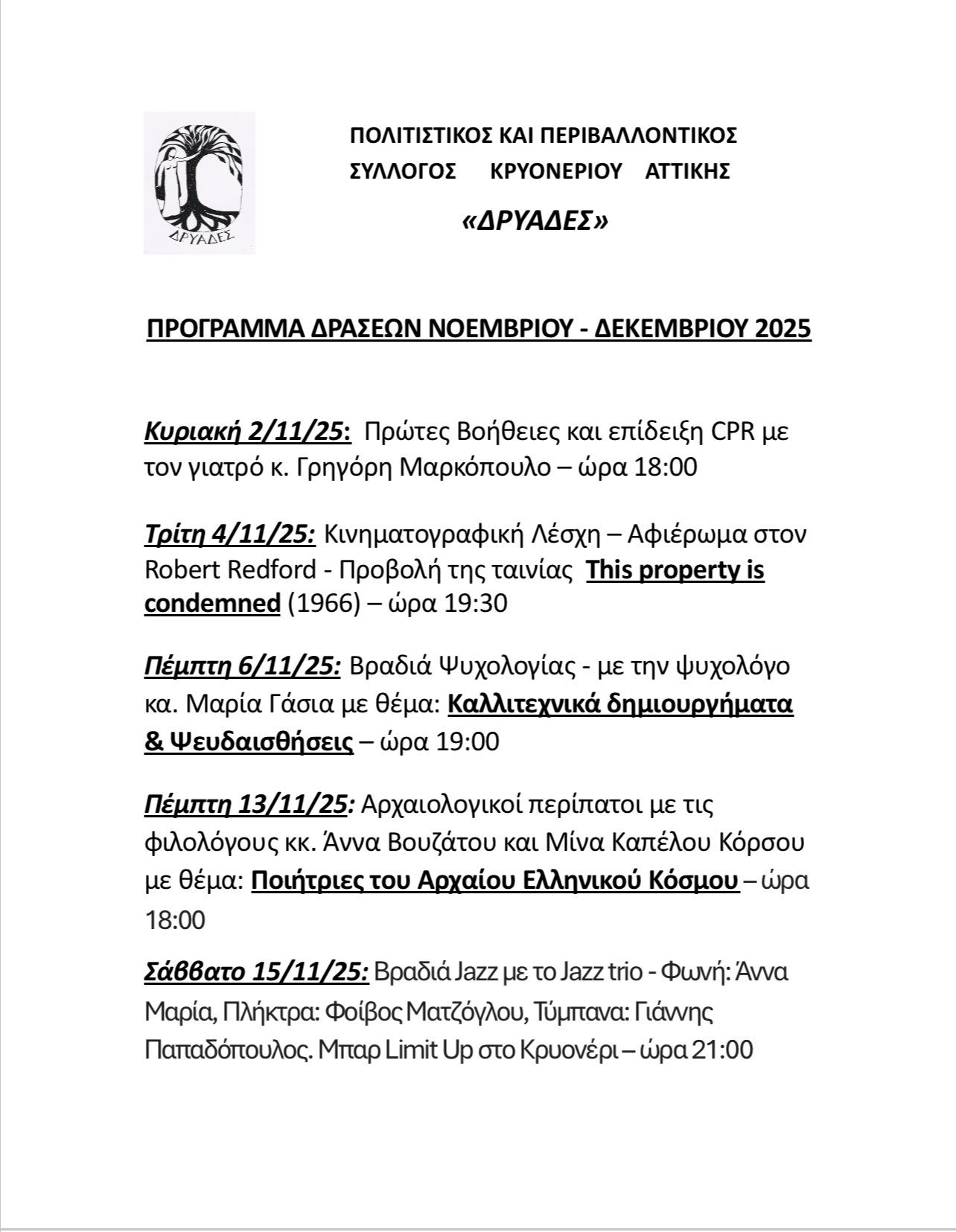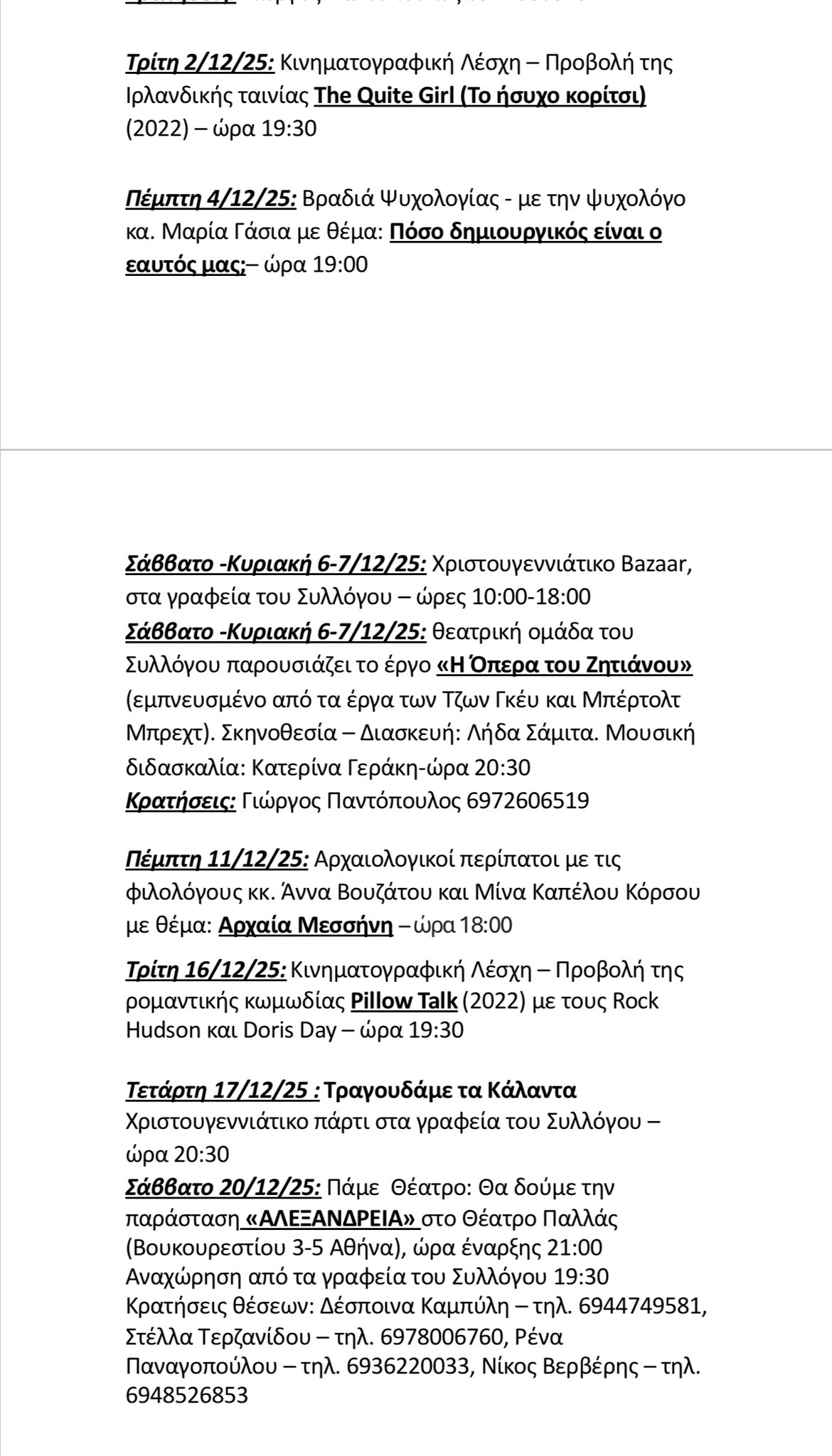 ü Πρόγραμμα με τις δράσεις του Συλλόγου για τους μήνες Νοέμβριο και Δεκέμβριο.