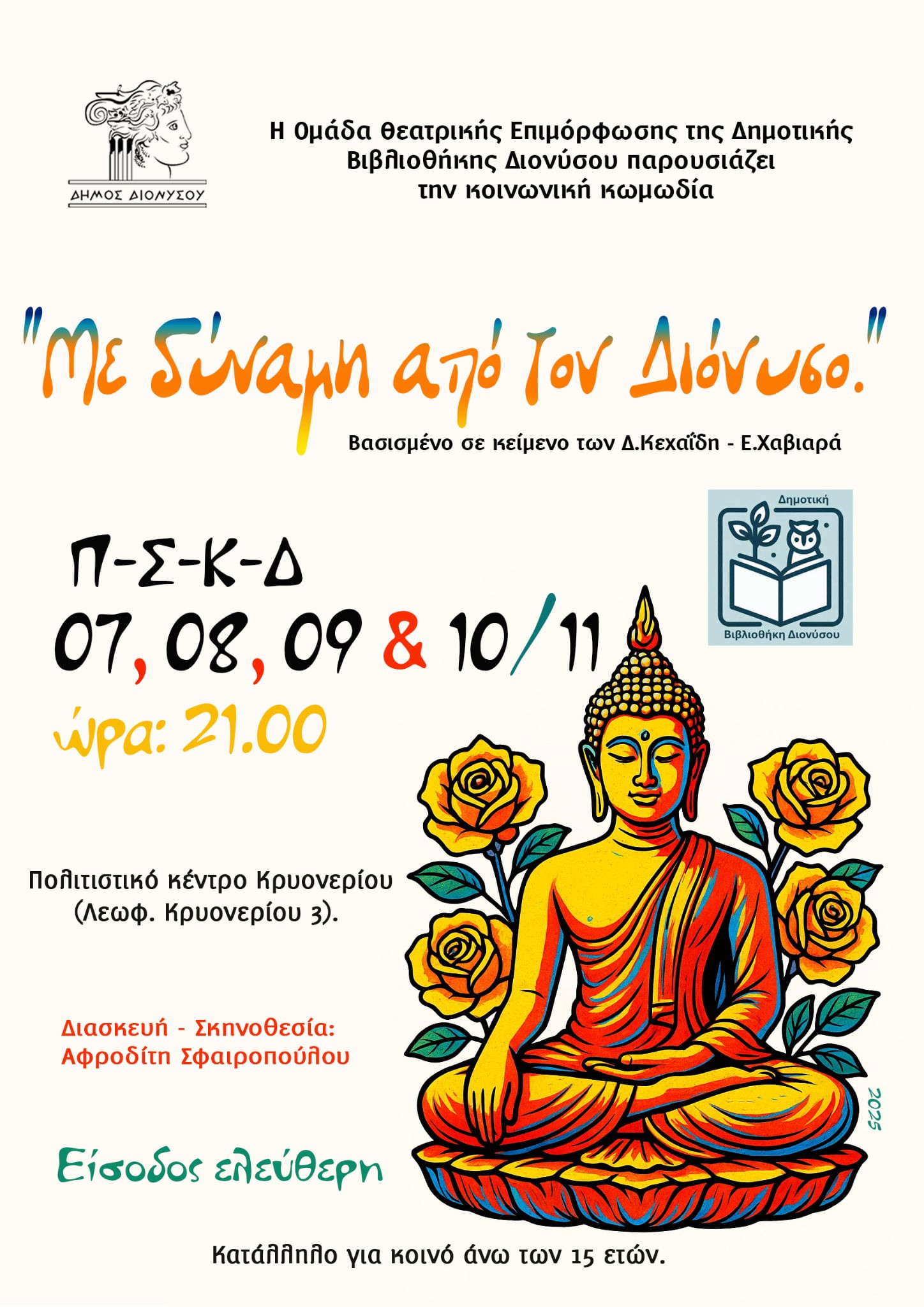 ü Η Ομάδα θεατρικής Επιμόρφωσης της Δημοτικής Βιβλιοθήκης Διονύσου παρουσιάζει την κοινωνική κωμωδία «Με Δύναμη από το Διόνυσο», σε διασκευή -σκηνοθεσία Αφροδίτης Σφαιροπούλου, την Παρασκευή 7, το Σάββατο 8, την Κυριακή 9 και τη Δευτέρα 10 Νοεμβρίου 2025-για 4 μόνο παραστάσεις, στις 21:00, στο Πολιτιστικό Κέντρο Κρυονερίου.