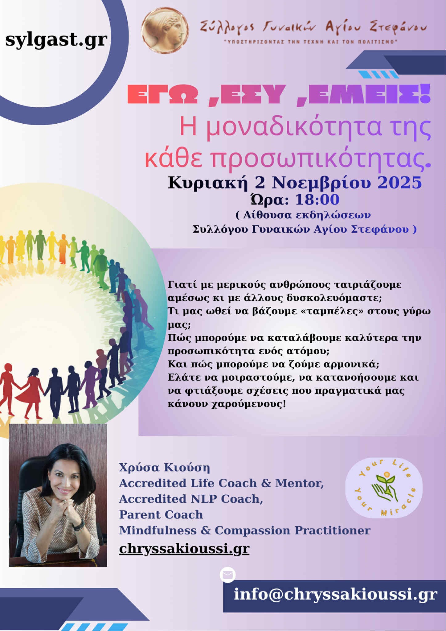ü Ο Σύλλογος Γυναικών Αγίου Στεφάνου την Κυριακή 02 Νοεμβρίου και ώρα 18:00 στην αίθουσα εκδηλώσεων του συλλόγου Γυναικών Αγίου Στεφάνου (Λ. Μαραθώνος 4, Άγιος Στέφανος) πραγματοποιεί ομιλία με θέμα: «Εγώ, Εσύ, Εμείς! Η μοναδικότητα κάθε προσωπικότητας» Ομιλήτρια η κ. Χρύσα Κιούση, accredited life coach @mentor,accredited NLP Coach, Parent coach, Mindfulness & Compassion practitioner
