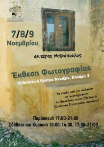 ü Την Παρασκευή 07 Νοεμβρίου και ώρες 17:00 -21 :00 το Σάββατο 08 και την Κυριακή 09 Νοεμβρίου και ώρες: 10:00-14:00 & 17:00-21:00, στο Πολιτιστικό Κέντρο της Άνοιξης (Κανάρη 3, Άνοιξη) θα παρουσιαστεί η Έκθεση φωτογραφίας του Λευτέρη Μαϊρόπουλου.