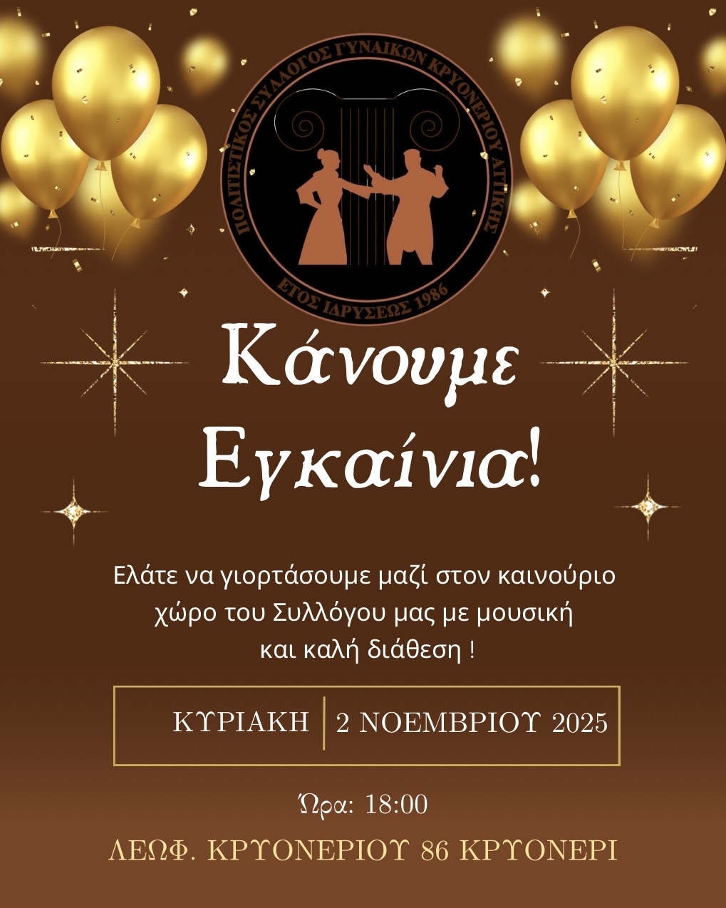 ü Ο Πολιτιστικός σύλλογος γυναικών Κρυονερίου κάνει εγκαίνια και απευθύνει πρόσκληση γιορτής, την Κυριακή 02 Νοεμβρίου και ώρα 18:00 στο χώρο του Συλλόγου, Λ. Κρυονερίου 86, Κρυονέρι.
