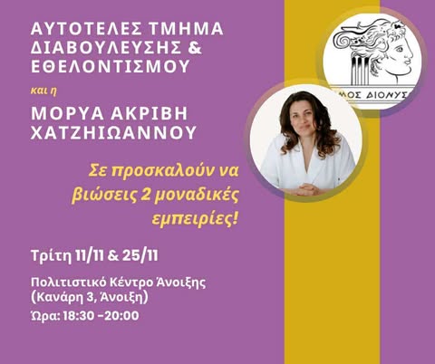 ü Το Αυτοτελές Τμήμα Διαβούλευσης και εθελοντισμού του Δήμου Διονύσου και η ενεργειακή θεραπεύτρια και πιστοποιημένη Coach Μόρυα Ακριβή Χατζηϊωάννου προχωρούν σε μια ακόμη καινοτόμα συνεργασία και σας προσκαλούν σε δύο βιωματικά σεμινάρια!