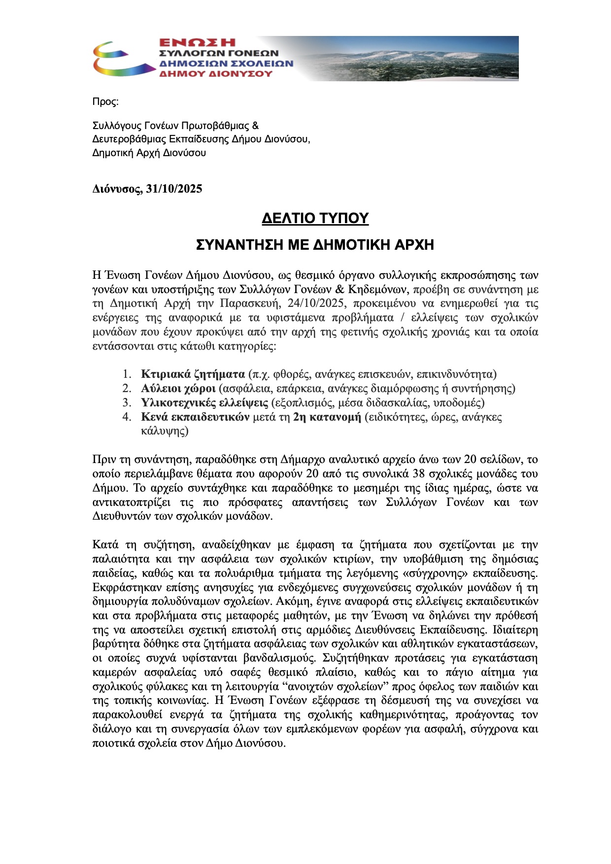Η Ένωση Γονέων Δήμου Διονύσου, ως θεσμικό όργανο συλλογικής εκπροσώπησης των γονέων και υποστήριξης των Συλλόγων Γονέων & Κηδεμόνων, προέβη σε συνάντηση με τη Δημοτική Αρχή την Παρασκευή, 24/10/2025, προκειμένου να ενημερωθεί για τις ενέργειές της αναφορικά με τα υφιστάμενα προβλήματα / ελλείψεις των σχολικών μονάδων που έχουν προκύψει από την αρχή της φετινής σχολικής χρονιάς και τα οποία εντάσσονται στις κάτωθι κατηγορίες: