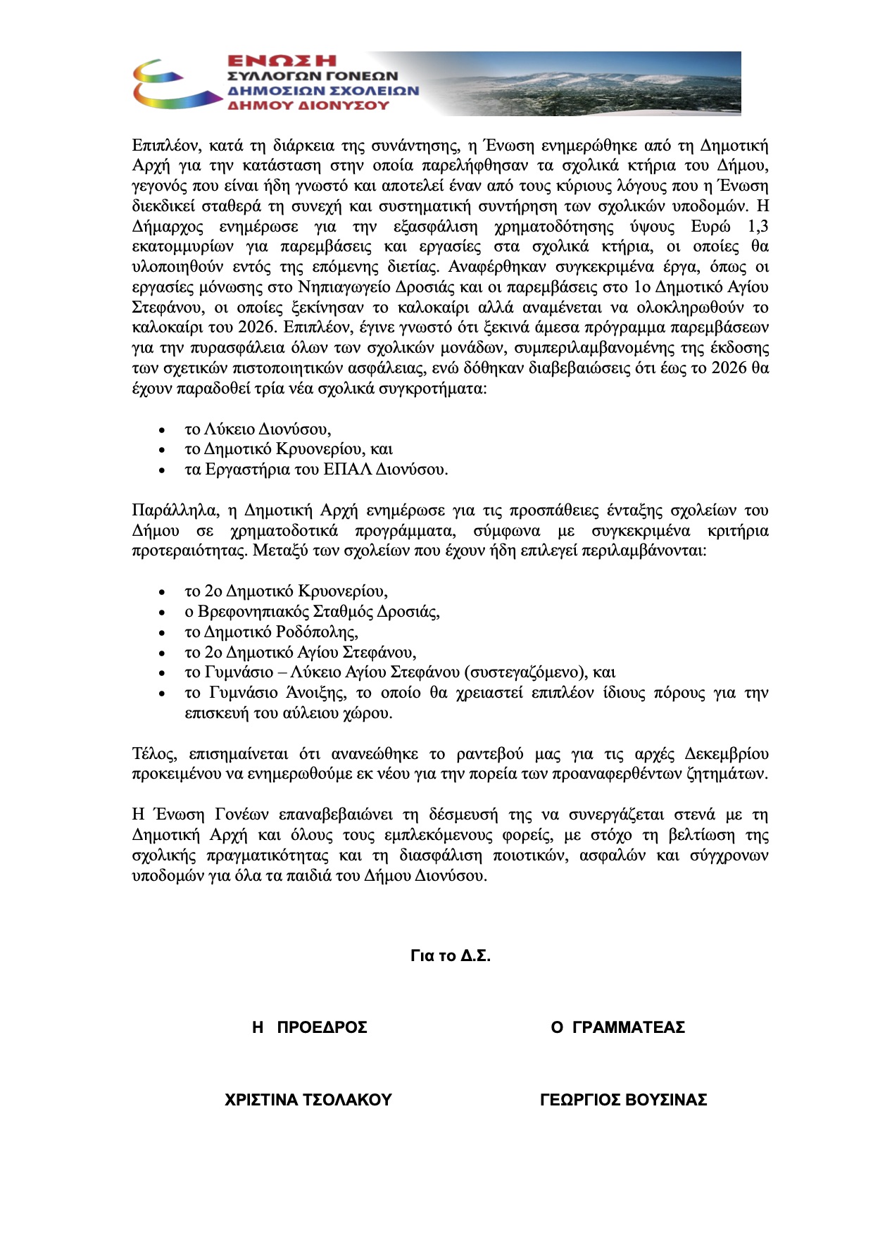 Η Ένωση Γονέων επαναβεβαιώνει τη δέσμευσή της να συνεργάζεται στενά με τη Δημοτική Αρχή και όλους τους εμπλεκόμενους φορείς, με στόχο τη βελτίωση της σχολικής πραγματικότητας και τη διασφάλιση ποιοτικών, ασφαλών και σύγχρονων υποδομών για όλα τα παιδιά του Δήμου Διονύσου.