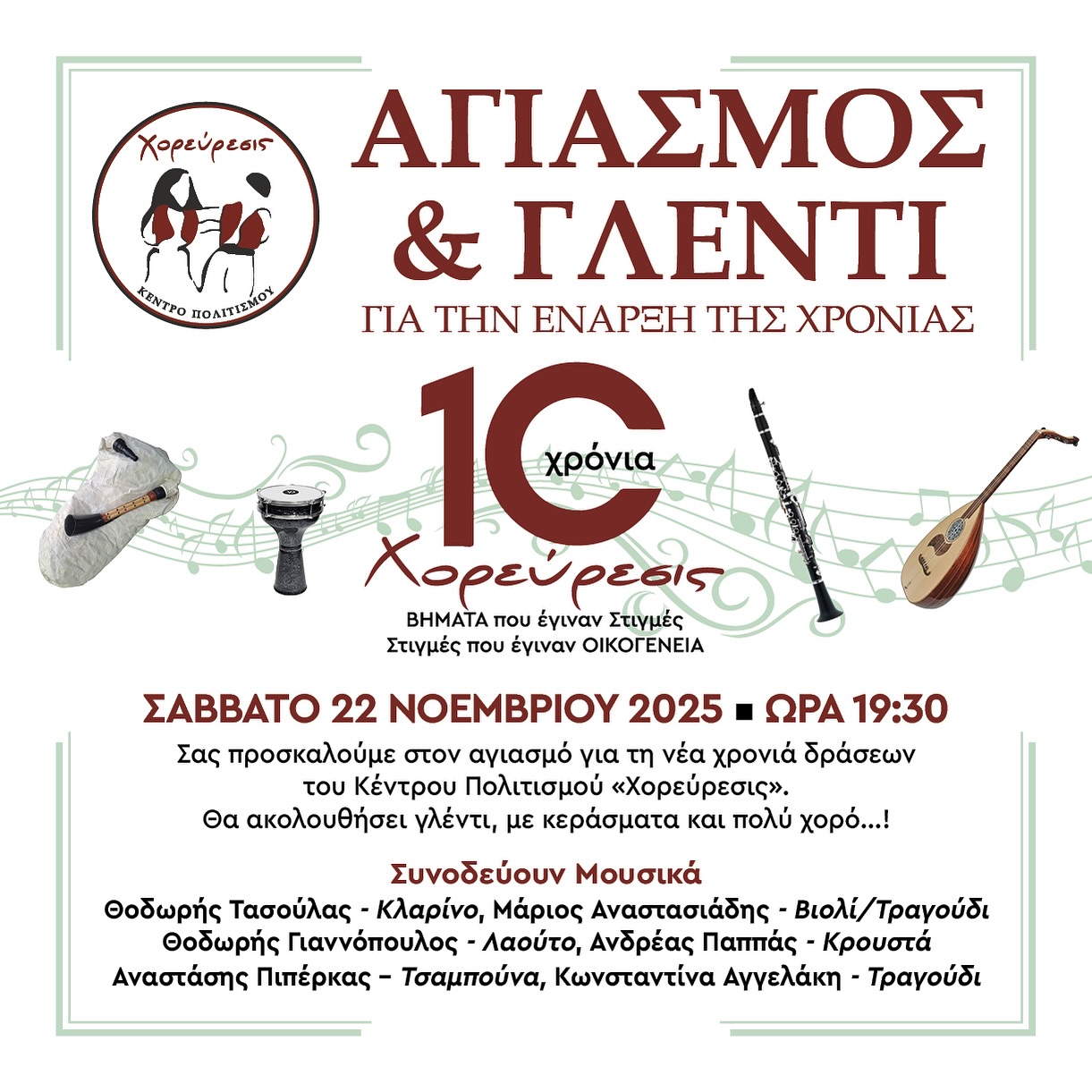Σας περιμένουμε με μεγάλη χαρά στη γιορτή που διοργανώνει το Κέντρο μας, Σάββατο 22 Νοεμβρίου 2025 και ώρα 19:30, για να γλεντήσουμε όλοι μαζί και να καλωσορίσουμε τη νέα πολιτιστική χρονιά