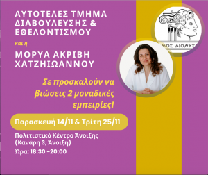 Κατόπιν προσωπικού κωλύματος της εισηγήτριας, ενεργειακής θεραπεύτριας και πιστοποιημένης Coach Μόρυας Ακριβής Χατζηιωάννου, μετατίθεται η 1η συνάντηση για το βιωματικό σεμινάριο: Αντί για αύριο Τρίτη 11/11/2025 το σεμινάριο θα πραγματοποιηθεί την Παρασκευή 14/11/2025  την ίδια ώρα και στο ίδιο μέρος, ήτοι στο Πολιτιστικό Κέντρο Άνοιξης (Κανάρη 3,14569 Άνοιξη) και ώρα: 18:30 -20:00!