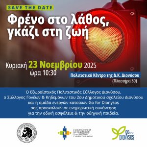 Σας προσκαλούμε σε μια ανοιχτή συνάντηση- ενημέρωση με θέμα την οδηγική ασφάλεια και την οδηγική παιδεία, που συνδιοργανώνουν ο Εξωραϊστικός και Πολιτιστικός Σύλλογος Διονύσου, ο Σύλλογος Γονέων και Κηδεμόνων 2ου Δημοτικού Σχολείου Διονύσου & η Ομάδα Ενεργών Κατοίκων Go For Dionysos.