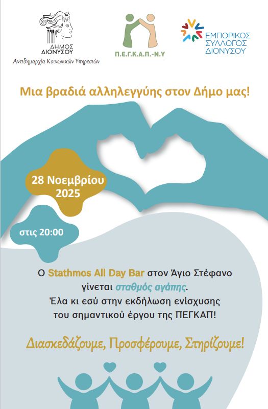 Σας καλούμε να στηρίξετε την εκδήλωση ενίσχυσης του σημαντικού έργου της ΠΕΓΚΑΠ, σε μια όμορφη βραδιά που ενώνει τον Δήμο μας και δείχνει τι σημαίνει να στεκόμαστε ο ένας δίπλα στον άλλον.