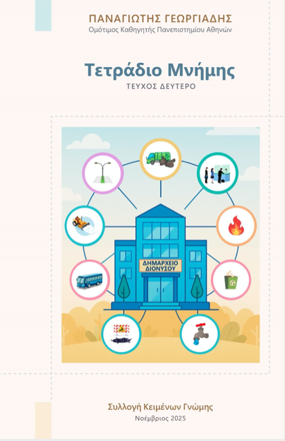 Με τίτλο “Τετράδιο Μνήμης-Τεύχος Δεύτερο” ετοιμάζεται να κυκλοφορήσει σε αποκλειστικά ηλεκτρονική μορφή τα κείμενά του, που η Οδός Διονύσου είχε την τιμή να φιλοξενήσει τον περασμένο χρόνο, ο ομότιμος καθηγητής Πληροφορικής στο ΕΚΠΑ Π. Γεωργιάδης. Η τοπική επικαιρότητα, αλλά όχι μόνο, είναι η αφορμή για την τακτική κατάθεση απόψεων, με ενδεικτικούς τίτλους: Η ελλιπέστατη ενημέρωση βλάπτει σοβαρά τους θεσμούς, Ο ασκός του Αιόλου και τα Τοπικά Πολεοδομικά Σχέδια, Ακραία κυβερνησιμότητα αντίθετη με την ομαλή δημοκρατική λειτουργία, Ανοιχτό Πανεπιστήμιο Δήμου Διονύσου, Από το «Ζητείται ελπίς» στο «Ζητείται όραμα». Αυτά και άλλα 30 κείμενα, συνολικά 35, ακουμπούν πτυχές της πόλης, ασκούν κριτική, παρακολουθούν στενά τις τοπικές εξελίξεις. Και- κυρίως- προτείνουν λύσεις, σε μια προσπάθεια του συγγραφέα να συμβάλει σε μια σύγχρονη αντιμετώπιση των προβλημάτων του Δήμου Διονύσου. Σημειώνεται πως εκτός από τα δημοσιευμένα, το δεύτερο αυτό Τεύχος περιλαμβάνει και τρία εξαιρετικά κείμενα που αναφέρονται στη σχέση και την επίδραση της Τεχνητής Νοημοσύνης στην Τέχνη.