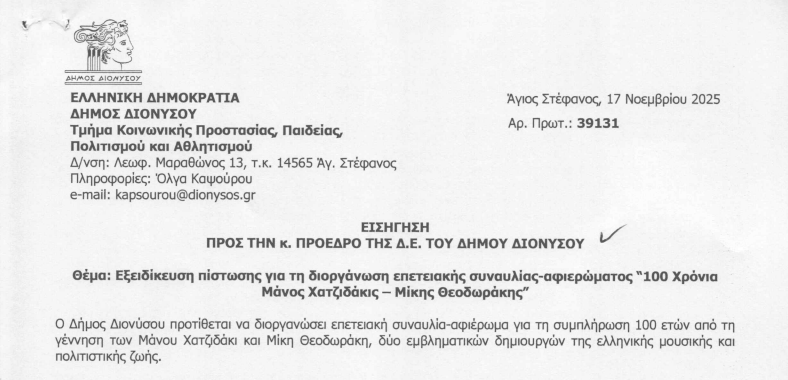 Διπλό μουσικό αφιέρωμα, στον Μάνο Χατζιδάκι και στον Μίκη Θεοδωράκη, για τα 100 χρόνια από τη γέννησή τους, ενέκρινε η Δημοτική Επιτροπή Διονύσου, την Τετάρτη 27 Νοεμβρίου. Η απόφαση μάλιστα ήταν ομόφωνη, παρά τις διαμαρτυρίες που ακούστηκαν και πάλι για “εκβιαστική εισήγηση της τελευταίας στιγμής” αλλά και για έλλειψη προγραμματισμού από την πλευρά της Αντιδημαρχίας Πολιτισμού.