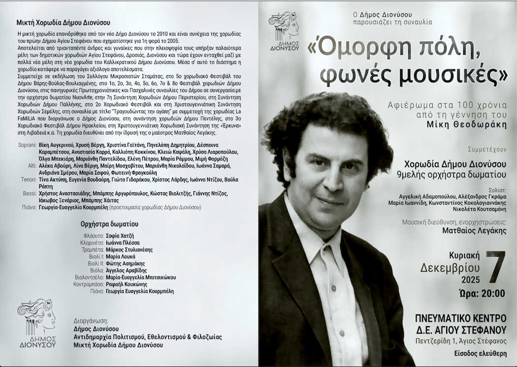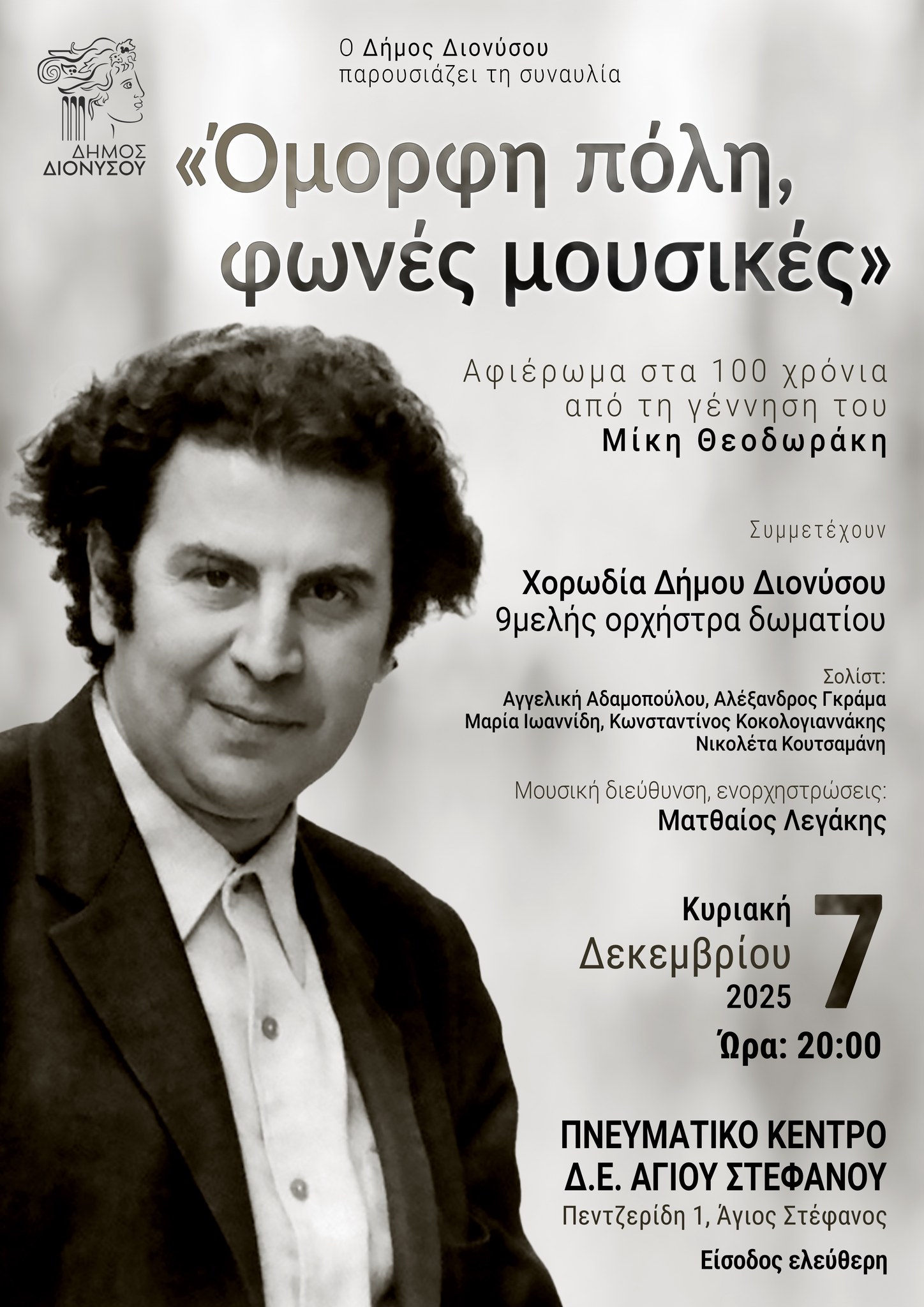 Εντούτοις η ανακοίνωση και η πρόσκληση του Δήμου Διονύσου αφορούν σε αφιέρωμα μονάχα στο Μίκη Θοεδωράκη, προγραμματισμένο για την Κυριακή 7 Δεκεμβρίου στις 8 το βράδυ, στο Πολιτιστικό Κέντρο Αγ. Στεφάνου, με τίτλο «Όμορφη πόλη, φωνές μουσικές”. Συμμετέχει η Μικτή Χορωδία του Δήμου καθώς και 9μελής Ορχήστρα Δωματίου, υπό τη διεύθυνση του μαέστρου Μ. Λεγάκη:
