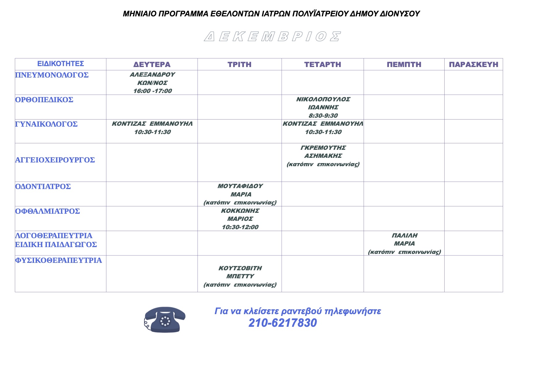 Για το μήνα Δεκέμβριο το πρόγραμμα επισκέψεων στους εθελοντές γιατρούς του Δημοτικού Πολυϊατρείου Διονύσου, έχει διαμορφωθεί ως εξής: