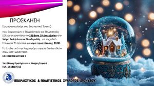 Με το μυαλό στην ενίσχυση των Εθελοντών Πολιτικής Προστασίας Διονύσου (ΣΕΠΠ Διονύσου) ο Εξωραϊστικός και Πολιτιστικός Σύλλογος της περιοχής οργανώνει εορταστικό τραπέζι το Σάββατο 20 Δεκεμβρίου στου Ελευθεριάδη, στη Δροσιά. Τα έσοδα από τη λαχειοφόρο αγορά θα διατεθούν για τις ανάγκες του ΣΕΠΠ: