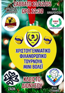 Ο ΑΟ ΔΙΟΝΥΣΟΥ διοργανώνει Φιλανθρωπικό τουρνουά Μίνι Βόλλεϋ το Σάββατο 13 Δεκεμβρίου στο Κλειστό Διονύσου 12.30- 14,30 με σκοπό την συγκέντρωση τροφίμων τα οποία μέσω της Ενορίας Αγίου Γεωργίου θα διατεθούν σε άπορες και πολύτεκνες οικογένειες. Θα συμμετάσχουν εκτός του ΑΟ ΔΙΟΝΥΣΟΥ και οι ομάδες ΖΑΟΝ, Αγίου Στεφάνου, Αμαζόνες Ερυθραίας, Νίκη Αμαρουσίου: