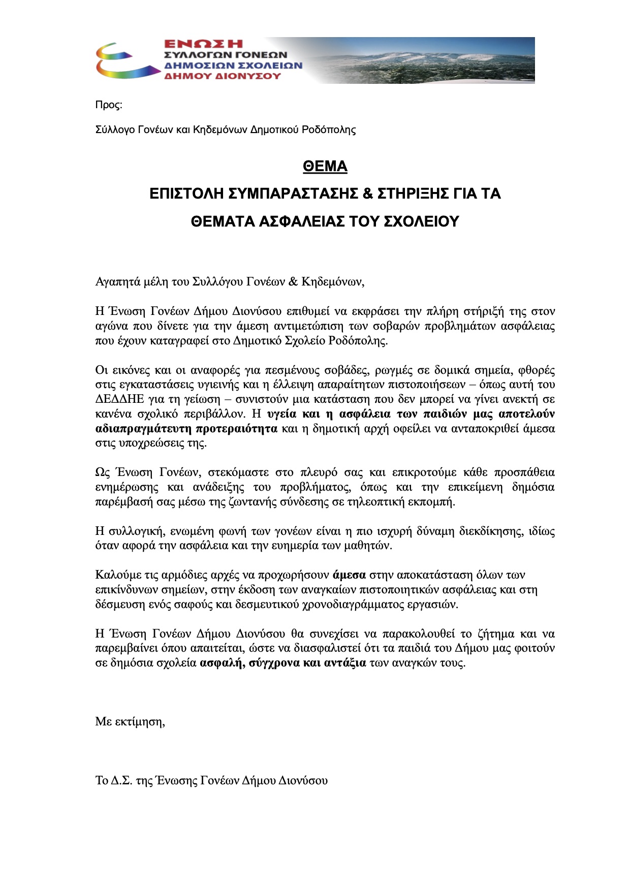 Η Ένωση Γονέων Δήμου Διονύσου επιθυμεί να εκφράσει την πλήρη στήριξή της στον αγώνα που δίνετε για την άμεση αντιμετώπιση των σοβαρών προβλημάτων ασφάλειας που έχουν καταγραφεί στο Δημοτικό Σχολείο Ροδόπολης.