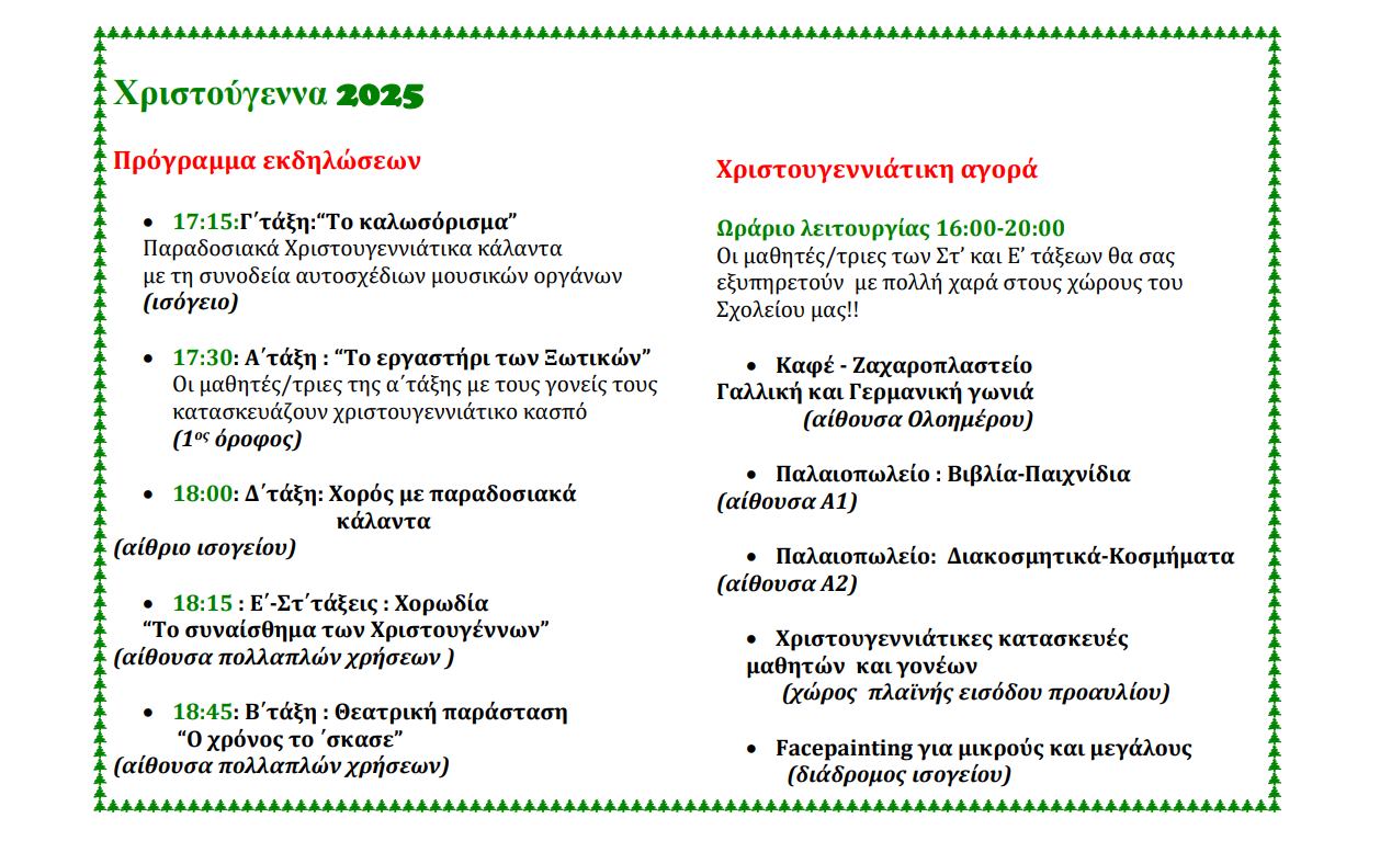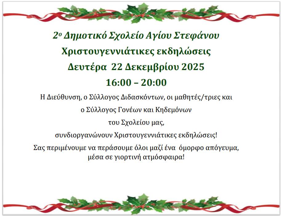 Χριστουγεννιάτικες εκδηλώσεις στο 2ο Δημοτικό Σχολείο Αγ. Στεφάνου από τη Διεύθυνση, τους δασκάλους, τους μαθητές και το Σύλλογο Γονέων
