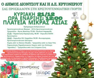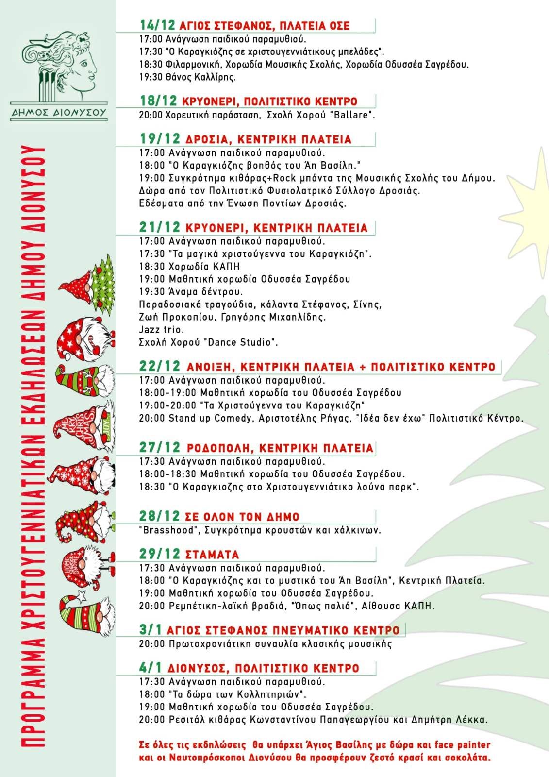Συνεχίζονται και τις επόμενες ημέρες οι χριστουγεννιάτικες εκδηλώσεις- γιορτές και bazaar- από Συλλόγους και φορείς στο Δήμο Διονύσου, και πιο συγκεκριμένα: