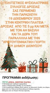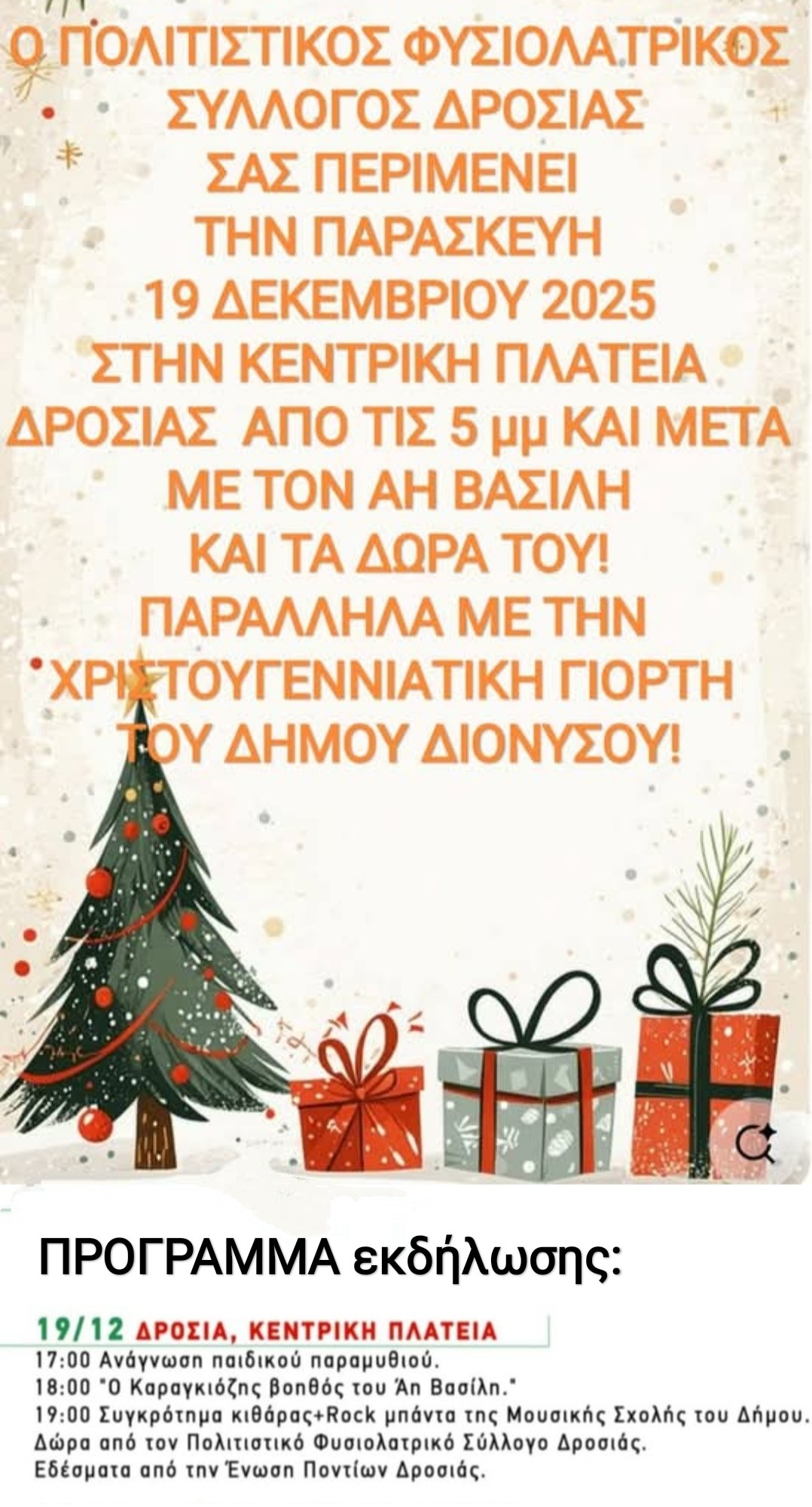 Χριστουγεννιάτικη Γιορτή του Δήμου στην κεντρική πλατεία της Δροσιάς. Ο πολιτιστικός Φυσιολατρικός Σύλλογος θα προσφέρει δώρα και η Ένωση Ποντίων εδέσματα