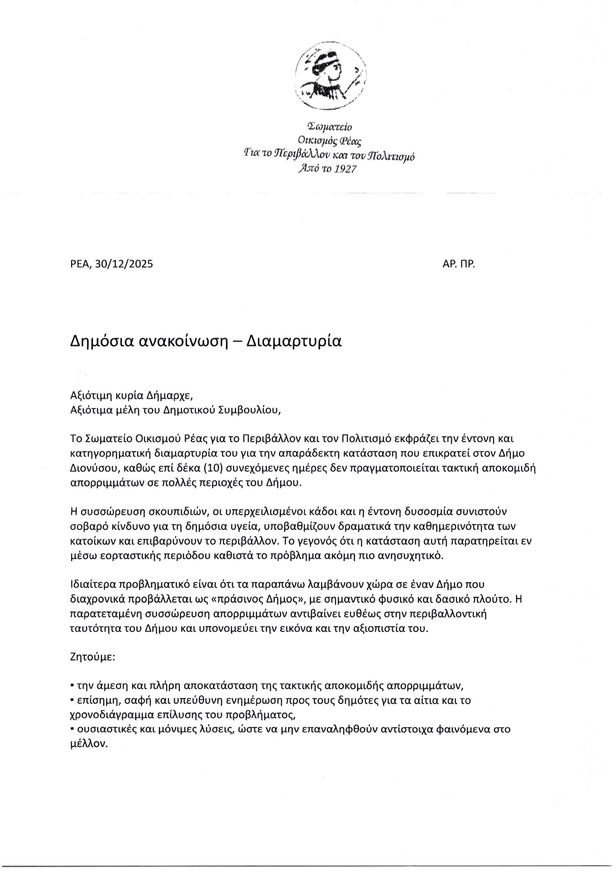 Σας κοινοποιούμε τη Δημόσια Ανακοίνωση – Διαμαρτυρία του Σωματείου Οικισμού Ρέας για το Περιβάλλον και τον Πολιτισμό, σχετικά με τη σοβαρή κατάσταση που έχει διαμορφωθεί στον Δήμο μας όσον αφορά την αποκομιδή απορριμμάτων.