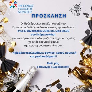 ΠΡΟΣΚΛΗΣΗ στην Κοπή Πίτας του Εμπορικού Συλλόγου Διονύσου!