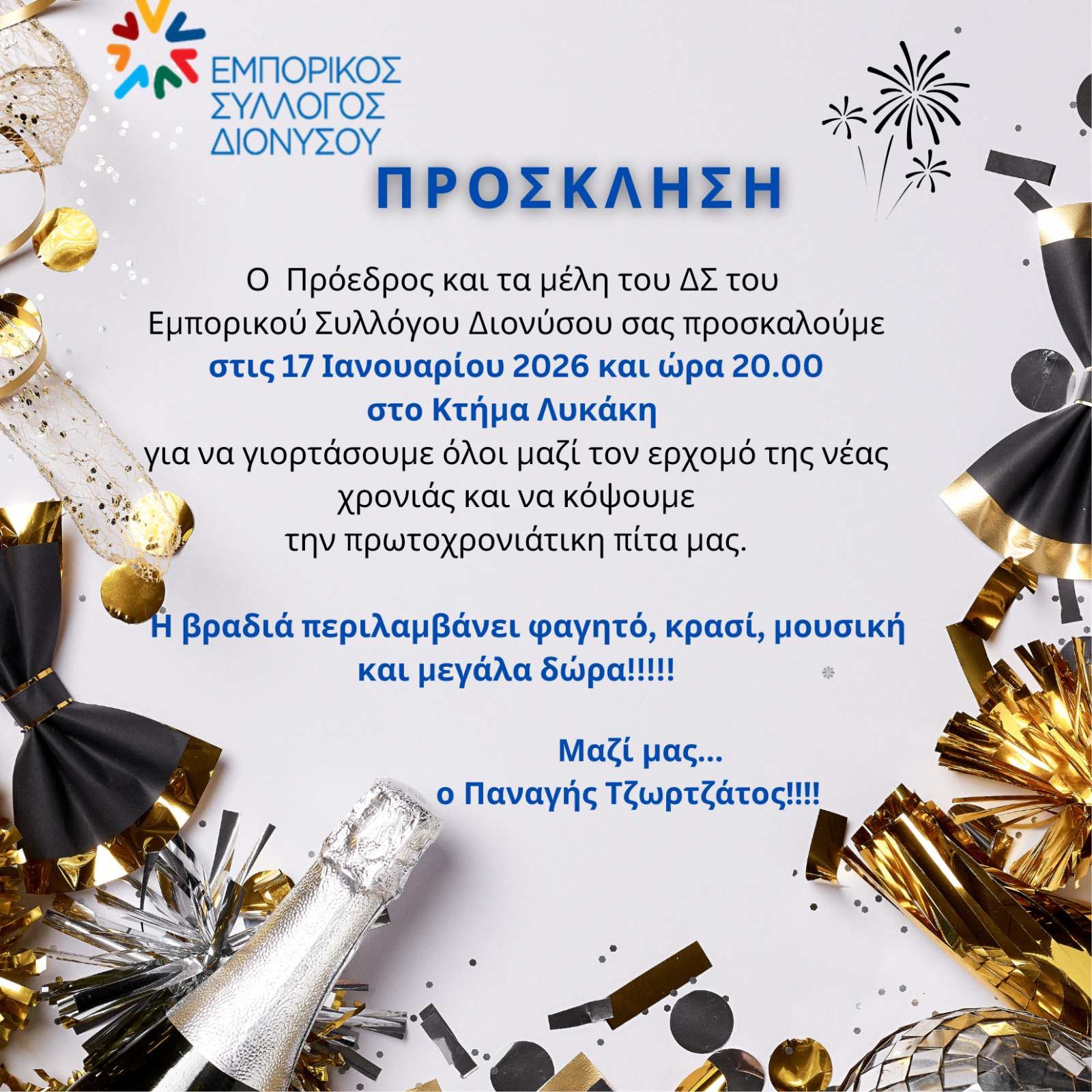 Ο Εμπορικός Σύλλογος Διονύσου σας προσκαλεί με μεγάλη χαρά στην πιο λαμπερή γιορτή για το καλωσόρισμα του 2026!