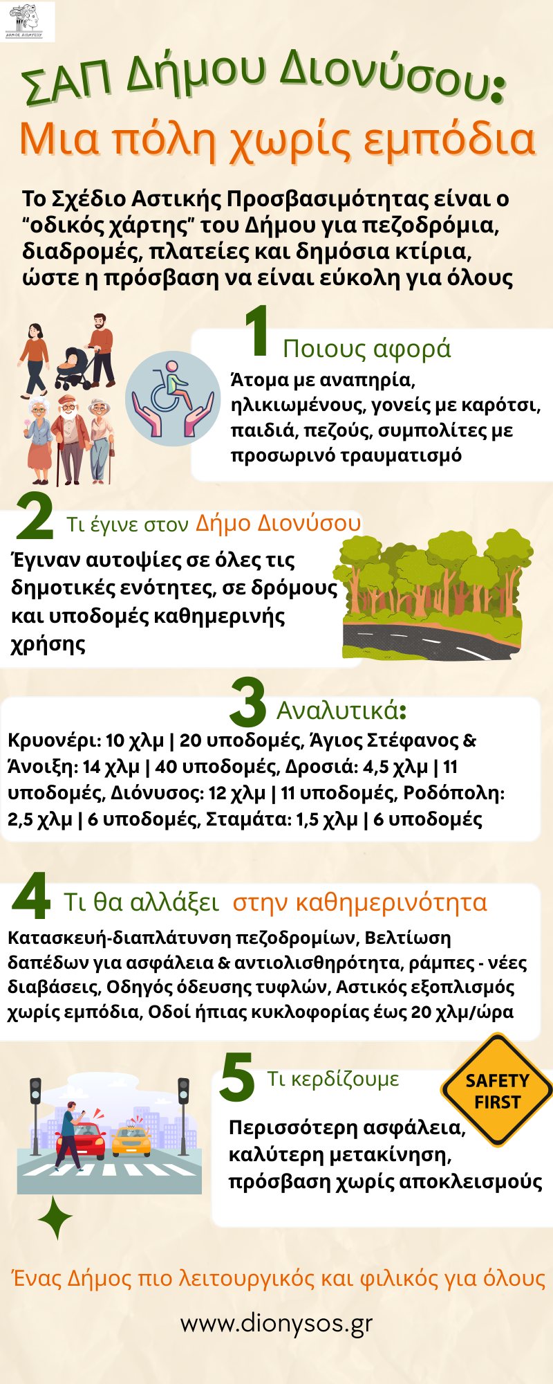 Ο Δήμος Διονύσου ολοκλήρωσε το Σχέδιο Αστικής Προσβασιμότητας, το ΣΑΠ, ένα κρίσιμο εργαλείο στρατηγικού σχεδιασμού που αποτυπώνει την πραγματική εικόνα στον δημόσιο χώρο και προτείνει συγκεκριμένες παρεμβάσεις για να εξασφαλιστεί ισότιμη πρόσβαση σε βασικές κοινόχρηστες και κοινωφελείς χρήσεις μέσα στα διοικητικά όρια του Δήμου.