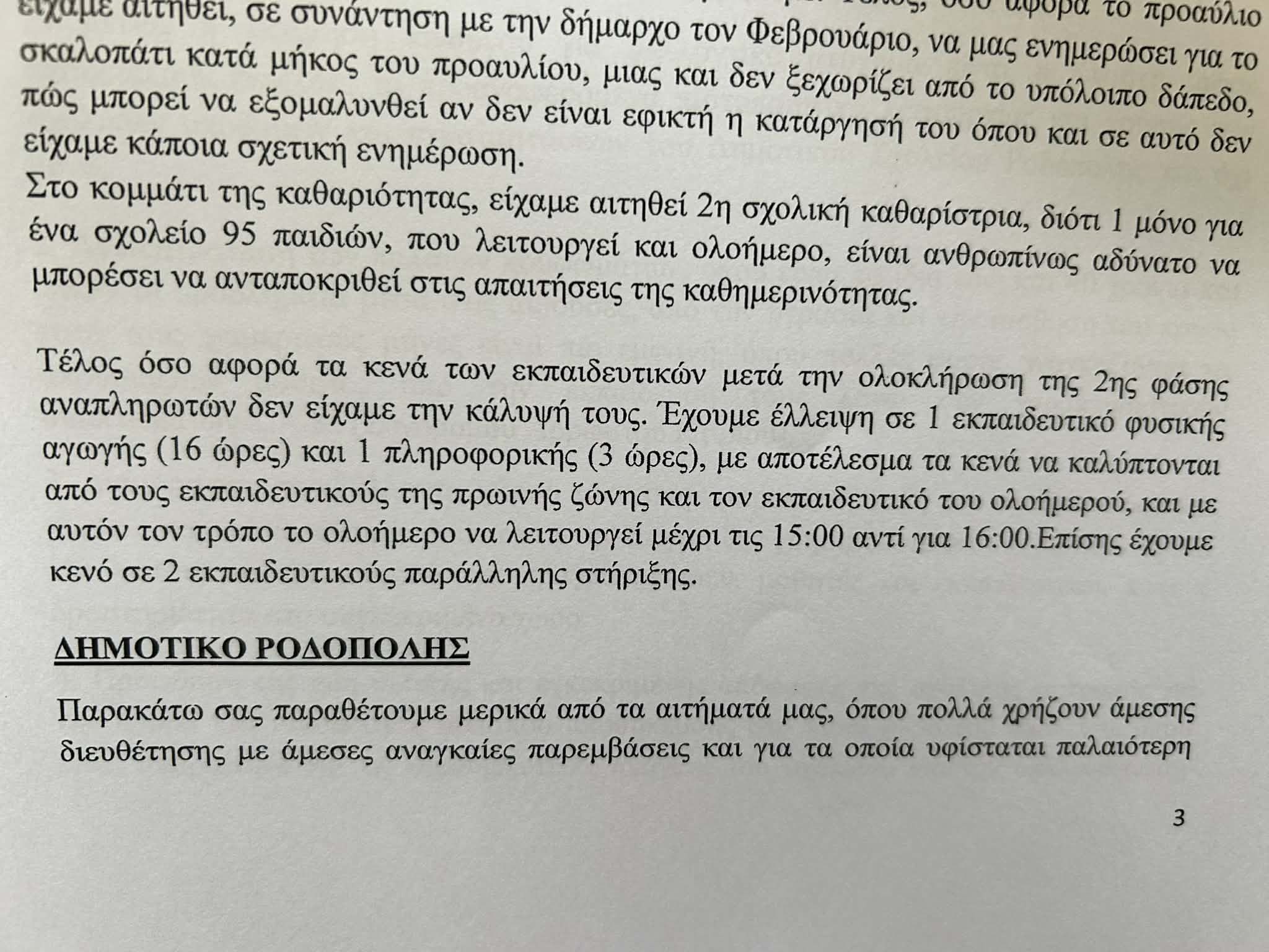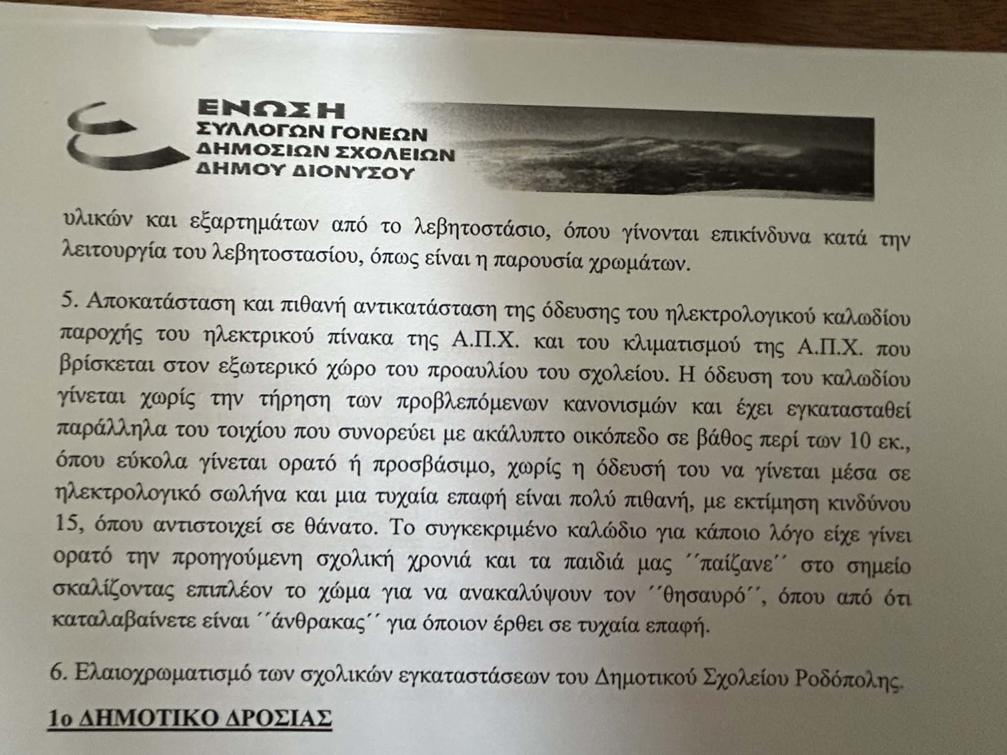 Μαζί με το Δημοτικό, ο επικεφαλής της Λαϊκής Συσπείρωσης Τ. Παντελόγλου έφερε στο Δημοτικό Συμβούλιο και αντίστοιχο ηλεκτρολογικό πρόβλημα που εντοπίζεται στο Νηπιαγωγείο και τον Παιδικό Σταθμό της Κοινότητας, που μοιράζονται τον ίδιο ηλεκτρολογικό πίνακα. Αλλά και γι’ αυτό η Δημοτική Επιτροπή έχει πάρει σχετική απόφαση, για διαχωρισμό της παροχής (“ΕΚΔΟΣΗ/ ΕΠΑΝΕΛΕΓΧΟΣ ΠΙΣΤΟΠΟΙΗΤΙΚΩΝ ΗΛΕΚΤΡΟΛΟΓΙΚΗΣ ΕΓΚΑΤΑΣΤΑΣΗΣ ΣΤΟΥΣ ΒΡΕΦ/ΚΟΥΣ ΚΑΙ ΠΑΙΔΙΚΟΥΣ ΣΤΑΘΜΟΥΣ ΤΟΥ Δ. ΔΙΟΝΥΣΟΥ – ΕΠΑΥΞΗΣΗ ΗΛ. ΠΑΡΟΧΗΣ ΣΕ Νο 4 ΣΤΗΝ ΑΝΟΙΞΗ- ΔΙΑΧΩΡΙΣΜΟΣ ΠΑΡΟΧΗΣ ΣΤΗ ΡΟΔΟΠΟΛΗ”), και μάλιστα από τις αρχές του 2025, με τρεις αλλεπάλληλες παρατάσεις.