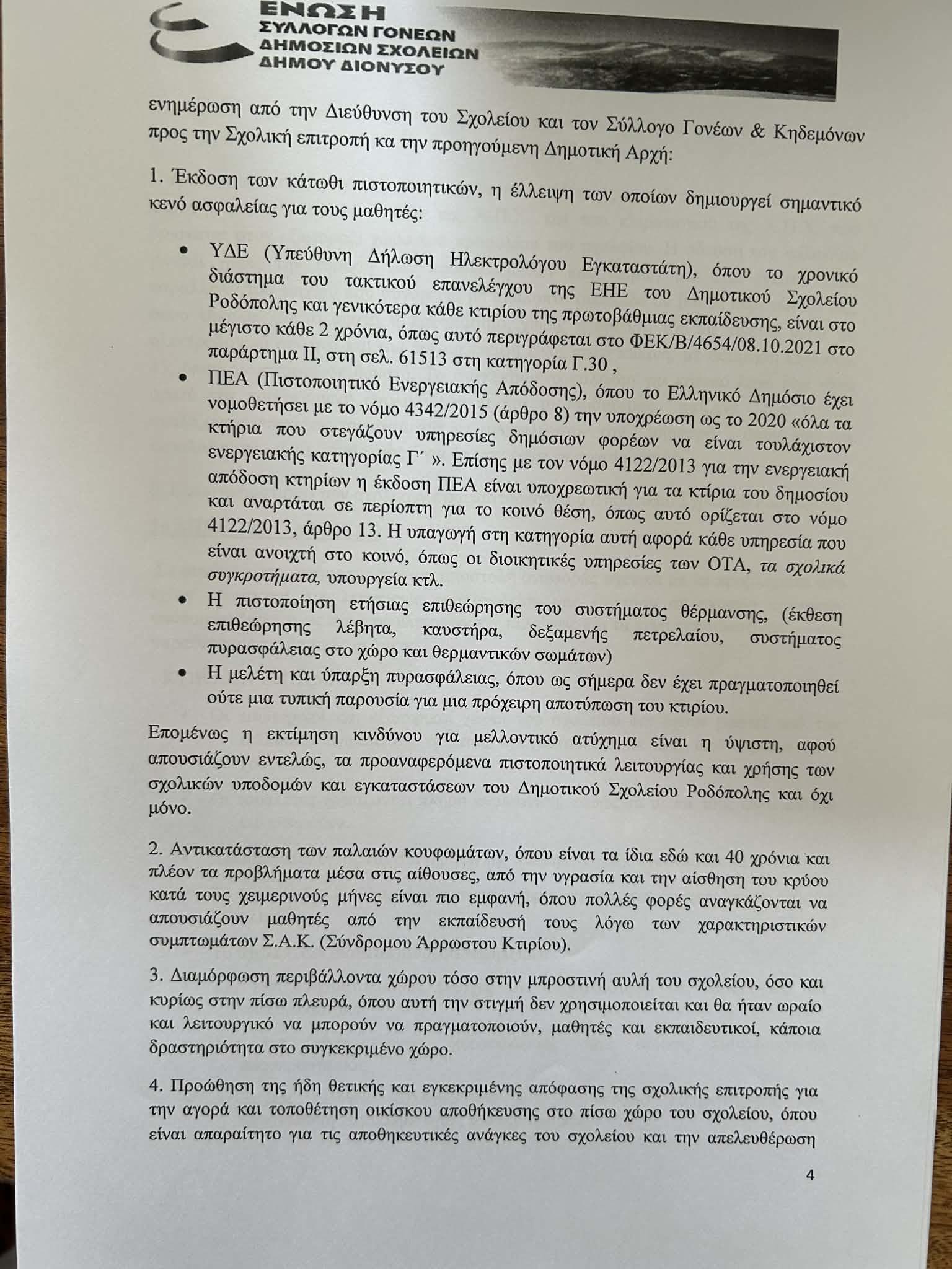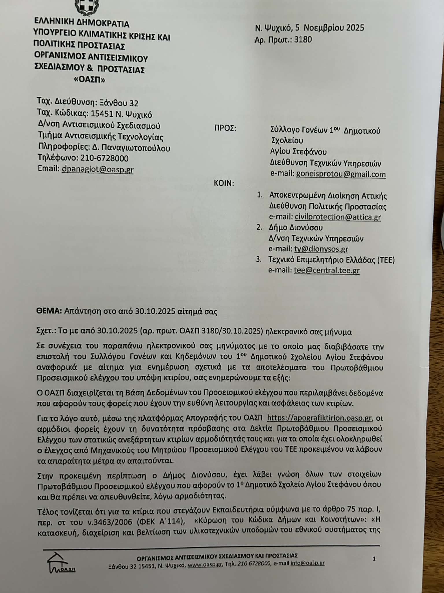 Όσο για το 1ο Δημοτικό Αγ. Στεφάνου, ο Ταμίας του Συλλόγου Χ. Καπαγερίδης για δεύτερη φορά μέσα σε ένα μήνα, διαμαρτυρήθηκε εκ μέρους του Συλλόγου επειδή η Δημοτική Αρχή συνεχίζει να αρνείται την παραχώρηση στους γονείς των αποτελεσμάτων από τον πρωτοβάθμιο προσεισμικό έλεγχο του σχολείου, που παρουσιάζει πολλά κτηριακά προβλήματα, όπως είχαν παρουσιαστεί σε παλαιότερο ρεπορτάζ της Οδού Διονύσου. Κι αυτό, παρά το έγγραφο του Οργανισμού Αντισεισμικής Προστασίας (ΟΑΣΠ) που προσκόμισε ο κ. Καπαγερίδης, και όπου ο Οργανισμός παροτρύνει το Σύλλογο να αναζητήσει τα αποτελέσματα του ελέγχου στο Δήμο: “Αν και πάλι η απάντηση είναι αρνητική, ρωτάμε γιατί. Γιατί δεν δίνονται τα αποτελέσματα ενός ελέγχου που αφορά στη στατική επάρκεια ενός δημόσιου σχολείου και την ασφάλεια των παιδιών μας, όπως προβλέπει η νομοθεσία για τα δημόσια έγγραφα”, υπογράμμισε ο κ. Καπαγερίδης, κατηγορώντας το Δήμο και για αυθαίρετη ερμηνεία αλλά και άρνηση χορήγησης εγγράφων: Το έγγραφο του ΟΑΣΠ , με την παραπάνω επισήμανση, έχει αποσταλεί στην Τεχνική Υπηρεσία του Δήμου από τον Νοέμβριο του 2025, δηλαδή ένα μήνα πριν οι γονείς αποφασίσουν να εκθέσουν δημοσίως για πρώτη φορά το πρόβλημα στο Δημοτικό Συμβούλιο.