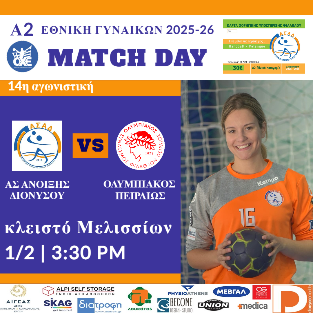 Σπουδαία αναμέτρηση περιλαμβάνει το πρόγραμμα της 14ης αγωνιστικής της Α2 Εθνικής Γυναικών, με τη γυναικεία ομάδα χάντμπολ του ΑΣΑ Διονύσου να υποδέχεται τον Ολυμπιακό Πειραιώς την Κυριακή 1 Φεβρουαρίου και ώρα 15:30, στο Κλειστό Γυμναστήριο Μελισσίων.