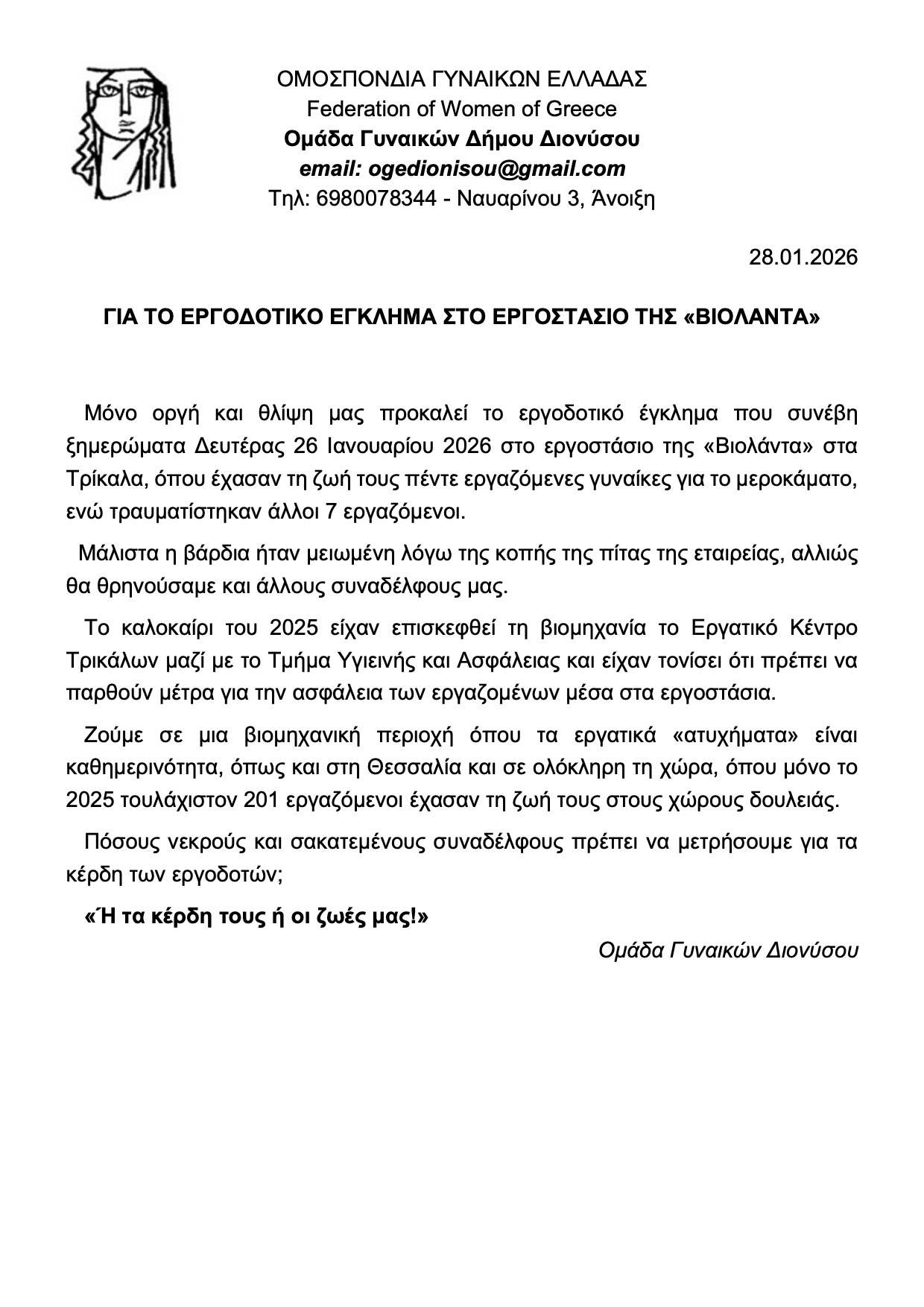 Μόνο οργή και θλίψη μας προκαλεί το εργοδοτικό έγκλημα που συνέβη ξημερώματα Δευτέρας 26 Ιανουαρίου 2026 στο εργοστάσιο της «Βιολάντα» στα Τρίκαλα, όπου έχασαν τη ζωή τους πέντε εργαζόμενες γυναίκες για το μεροκάματο, ενώ τραυματίστηκαν άλλοι 7 εργαζόμενοι.