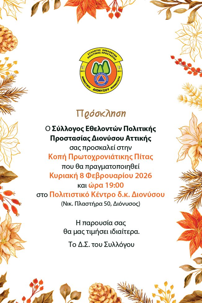 Οι Εθελοντές Πολιτικής Προστασίας Διονύσου (eppd.gr) σας προσκαλούν στην καθιερωμένη κοπή της Βασιλόπιτας, την Κυριακή 8 Φεβρουαρίου 2026, στις 19:00, στο Πολιτιστικό Κέντρο Δημοτικής Κοινότητας Διονύσου (Νικ. Πλαστήρα 50, Διόνυσος).