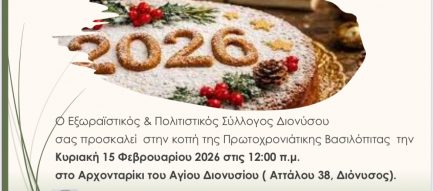 ΠΡΟΣΚΛΗΣΗ Ο Εξωραϊστικός και Πολιτιστικός Σύλλογος Διονύσου, προσκαλεί τα μέλη και τους φίλους του στην κοπή της Πρωτοχρονιάτικης Πίτας Κυριακή 15 Φεβρουαρίου 2026 Ώρα 12:00 π.μ. [...]