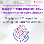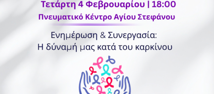 ΠΡΟΣΚΛΗΣΗ Με μεγάλη χαρά σάς προσκαλούμε σε μια εξαιρετικά ενδιαφέρουσα δράση την Τετάρτη 04 Φεβρουαρίου, Παγκόσμια Ημέρα κατά του Καρκίνου, και ώρα 18:00 στο Πολιτιστικό Κέντρο Αγ[...]