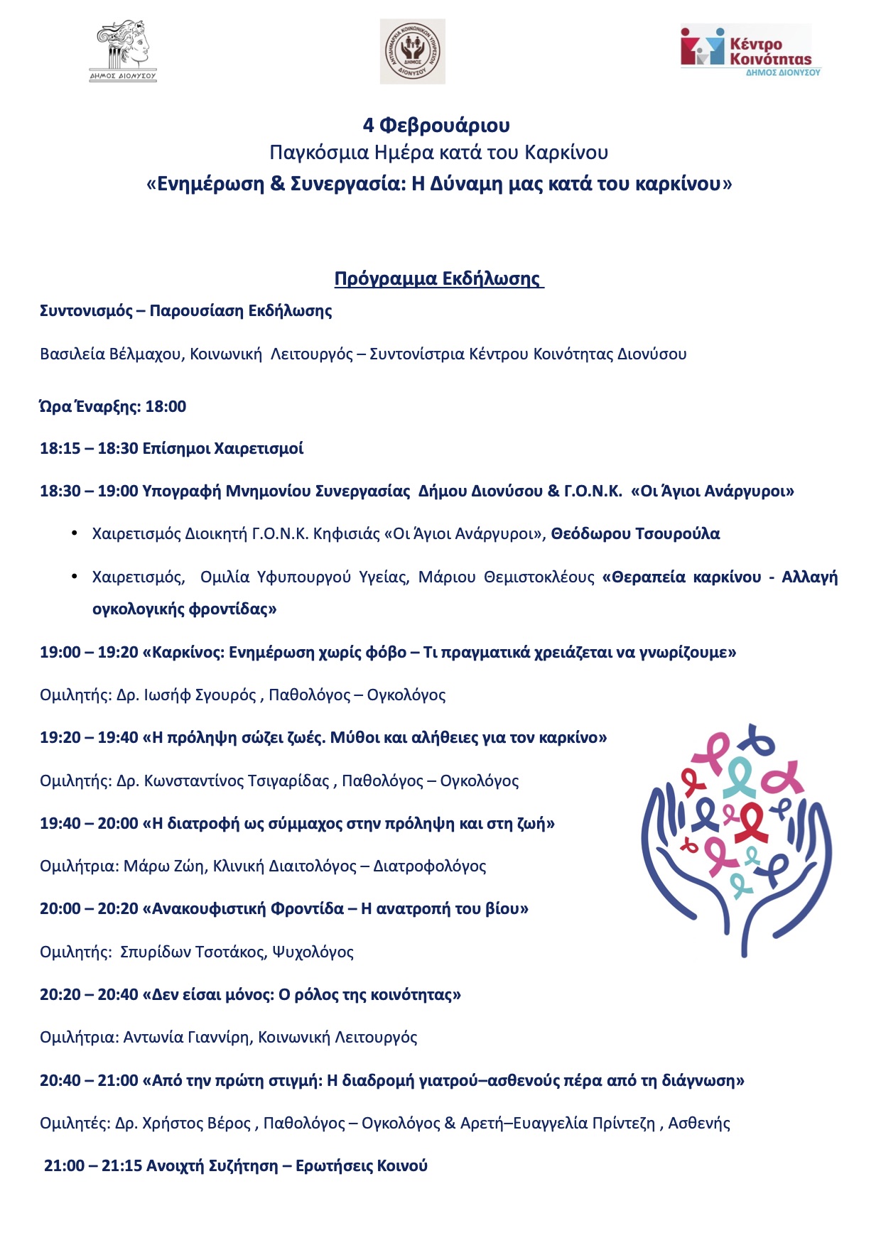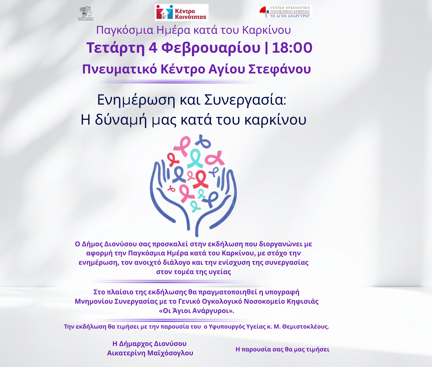 Στο πλαίσιο της εκδήλωσης, όπου θα παραστεί και την οποία θα χαιρετίσει ο υφυπουργός Υγείας Μ. Θεμιστοκλέους, θα υπογραφεί Μνημόνιο Συνεργασίας ανάμεσα στο Δήμο Διονύσου και το Γενικό Ογκολογικό Νοσοκομείο Κηφισιάς “Οι Άγιοι Ανάργυροι”.