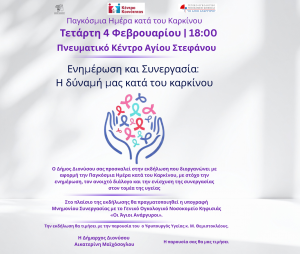 Τετάρτη 04 Φεβρουαρίου, Παγκόσμια Ημέρα κατά του Καρκίνου, και ώρα 18:00 στο Πολιτιστικό Κέντρο Αγίου Στεφάνου, με θέμα «Η Δύναμή μας κατά του καρκίνου”.