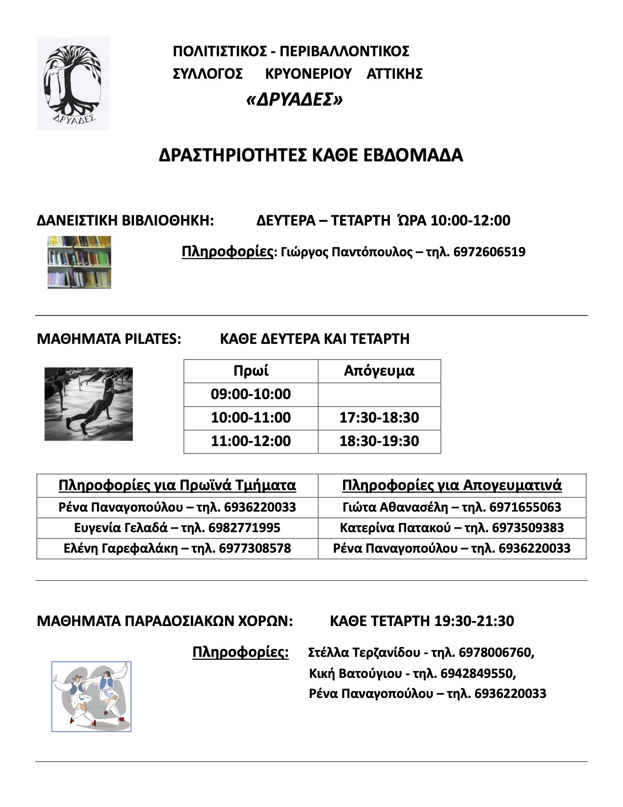 Με βραδιά ψυχολογίας ξεκινούν και τριήμερη εκδρομή στο Γύθειο κλείνουν οι εκδηλώσεις του  Πολιτιστικού και Περιβαλλοντικού Συλλόγου “Δρυάδες” για το Μάρτιο. Προηγείται πάντως η ετήσια Γενική Συνέλευση, που έχει προγραμματισθεί για αύριο Κυριακή 22 Φεβρουαρίου, και- σε περίπτωση μη απαρτίας- για την Κυριακή 1 Μαρτίου: