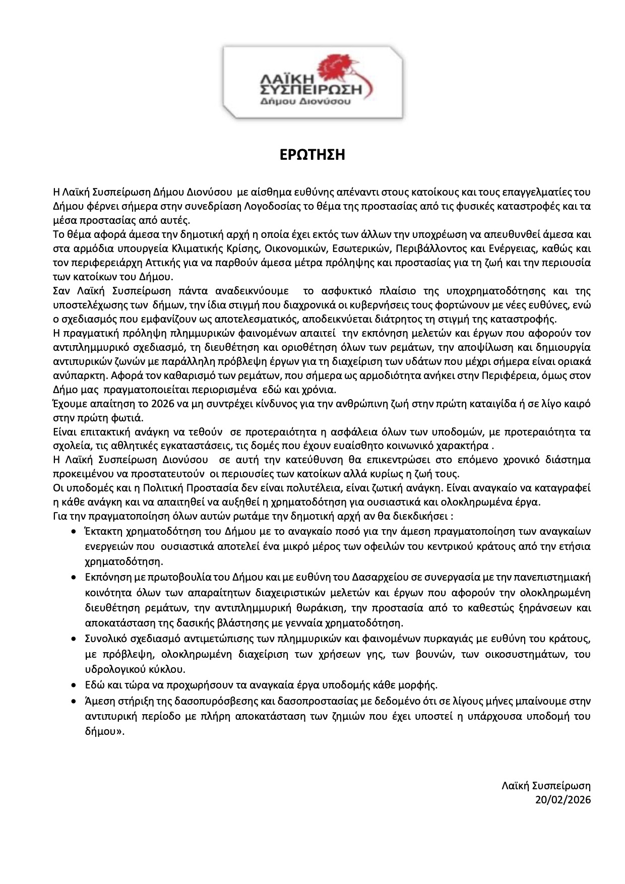 Η Λαϊκή Συσπείρωση Δήμου Διονύσου με αίσθημα ευθύνης απέναντι στους κατοίκους και τους επαγγελματίες του Δήμου φέρνει σήμερα στην συνεδρίαση Λογοδοσίας το θέμα της προστασίας από τις φυσικές καταστροφές και τα μέσα προστασίας από αυτές.