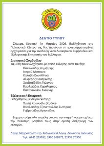 Πραγματοποιήθηκαν σήμερα, Κυριακή 1 Μαρτίου, αρχαιρεσίες για την ανάδειξη νέου Διοικητικού Συμβουλίου στο Σύλλογο Εθελοντών Πολιτικής Προστασίας Διονύσου, με τα παρακάτω αποτελέσματα: