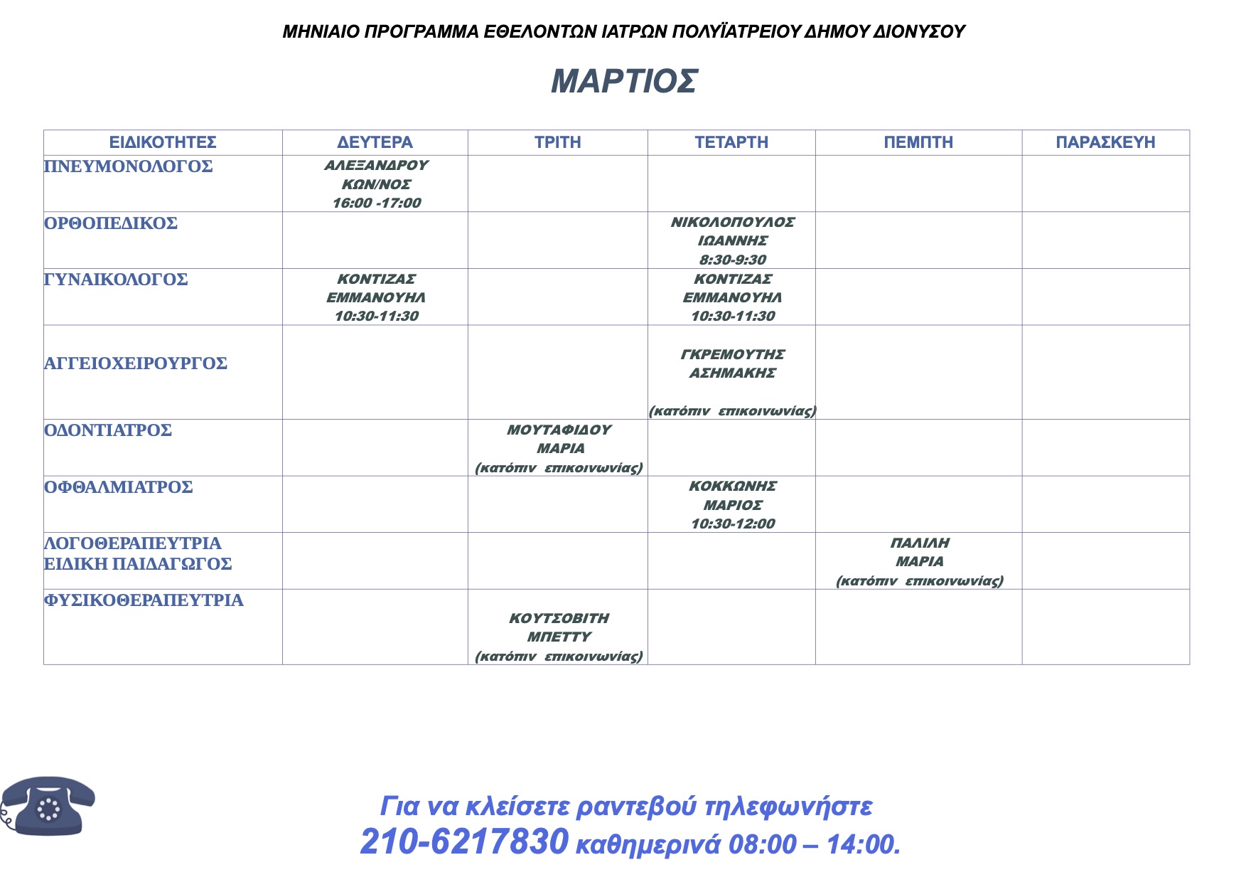 Το πρόγραμμα επισκέψεων για το μήνα Μάρτιο στο Δημοτικό Πολυϊατρείο Διονύσου διαμορφώνεται ως εξής: